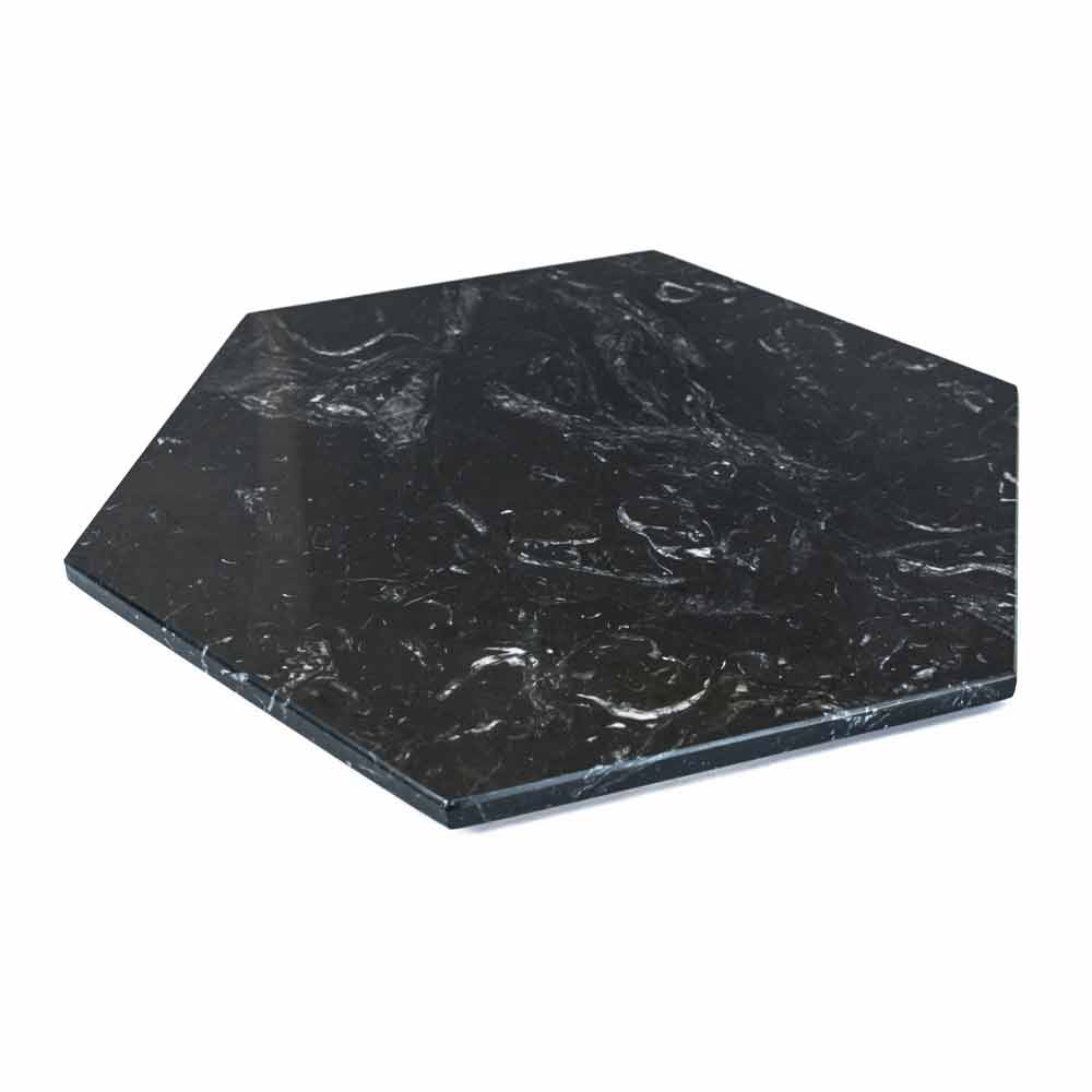 Modernes sechseckiges Servier- Design aus elegantem Marmor in zwei Ausführungen mit darunterliegender Korkschicht und dank seines innovativen Designs auch als Tablett oder Schneidebrett verwendbar.