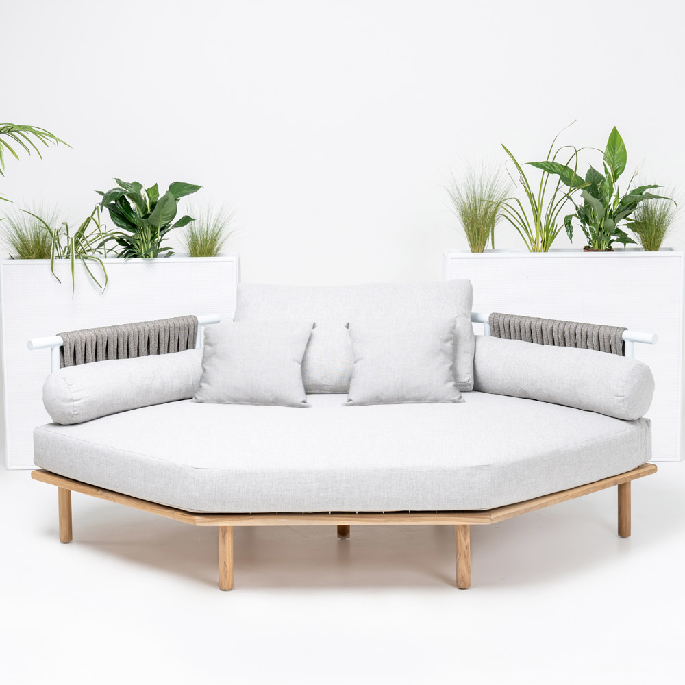 Achteckiges Garten-Ecksofa aus Teakholz, Aluminium-Rückenlehnen und Geflecht aus Olefin/PP ROPE und Kissen
