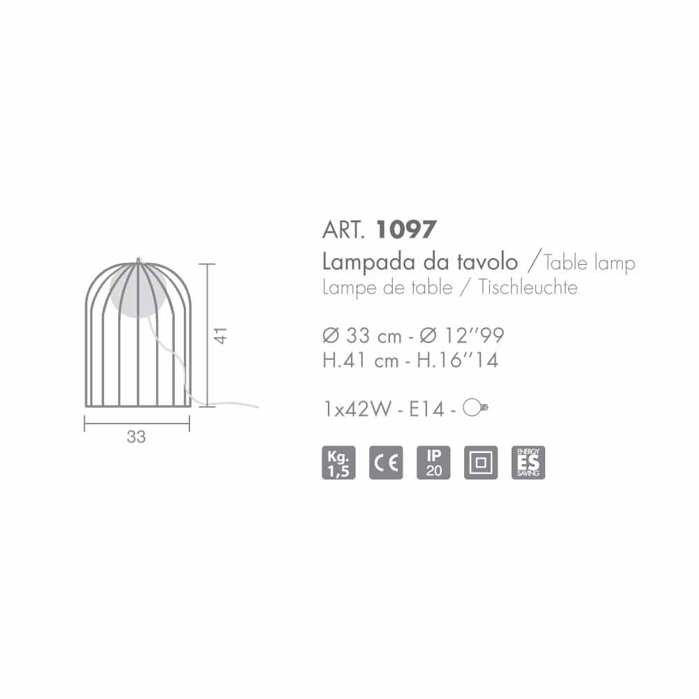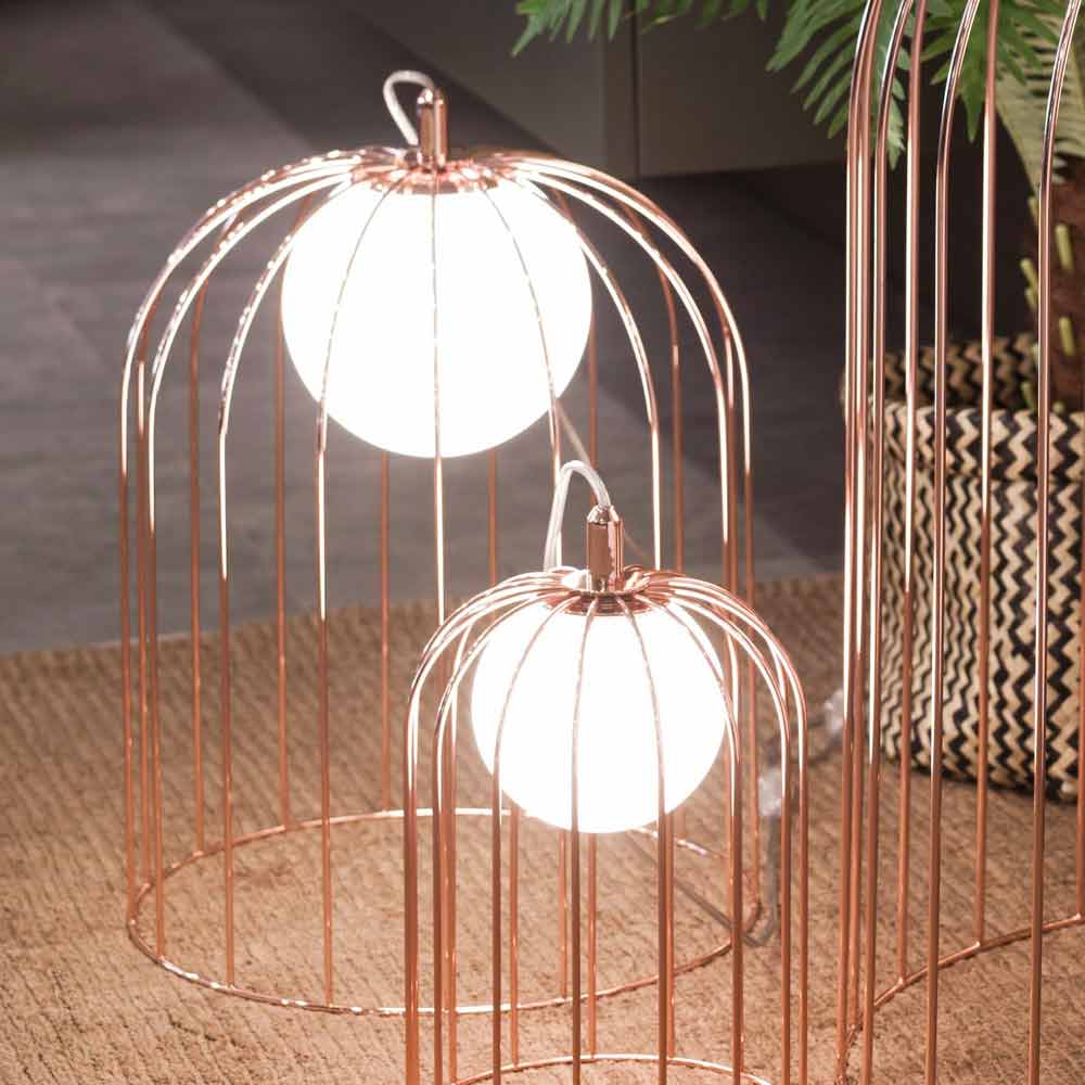 Kluvì ist eine Tischlampe, die aus einem Metallkäfig und einer weiß geblasenen Glaskugel besteht. Verarbeitung: poliertes Kupfer; vorbereitet für den Gebrauch von 1 Birne 42W - E14.
