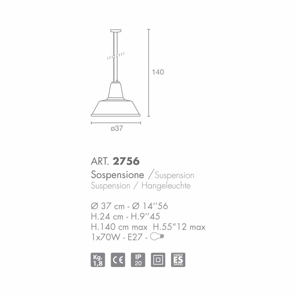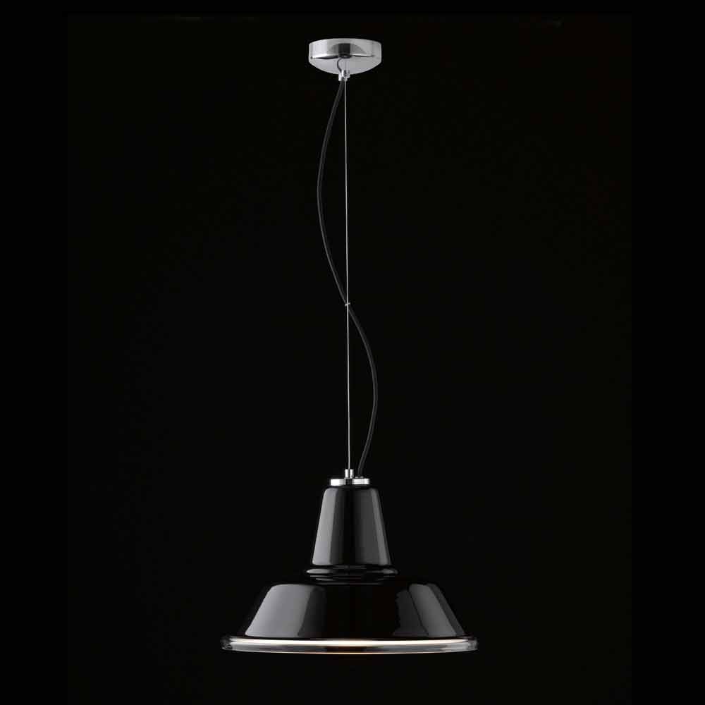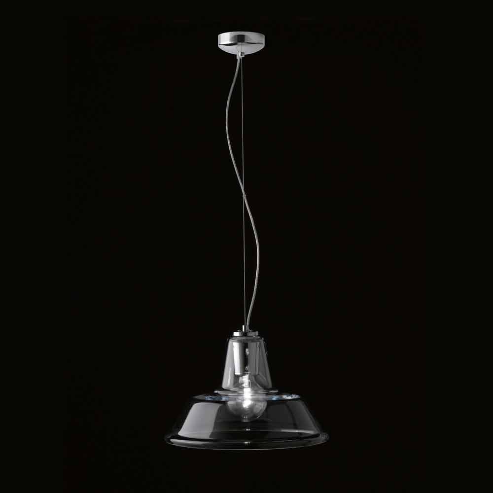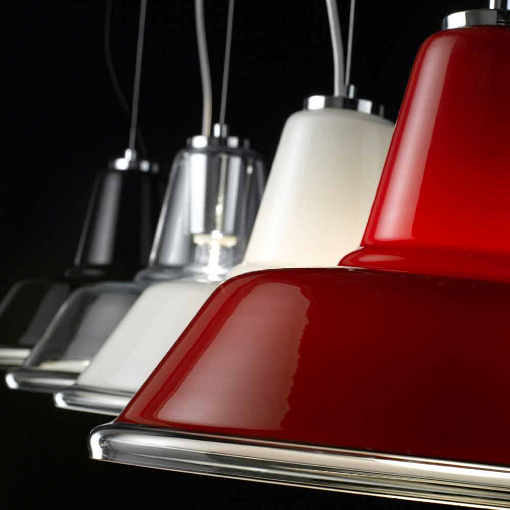 Lampara Hängeleuchte mit einem erkennbaren Industriedesign, geschaffen durch einen speziellen mundgeblasenen Glasdiffusor. Die verfügbaren Oberflächen sind: transparent, weiß, schwarz oder rot, mit Chromrahmen. Es ist entworfen, um 1 70W E27 Birne zu benutzen.