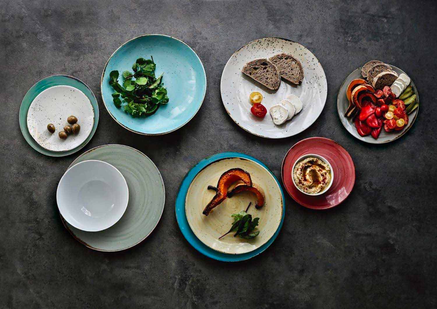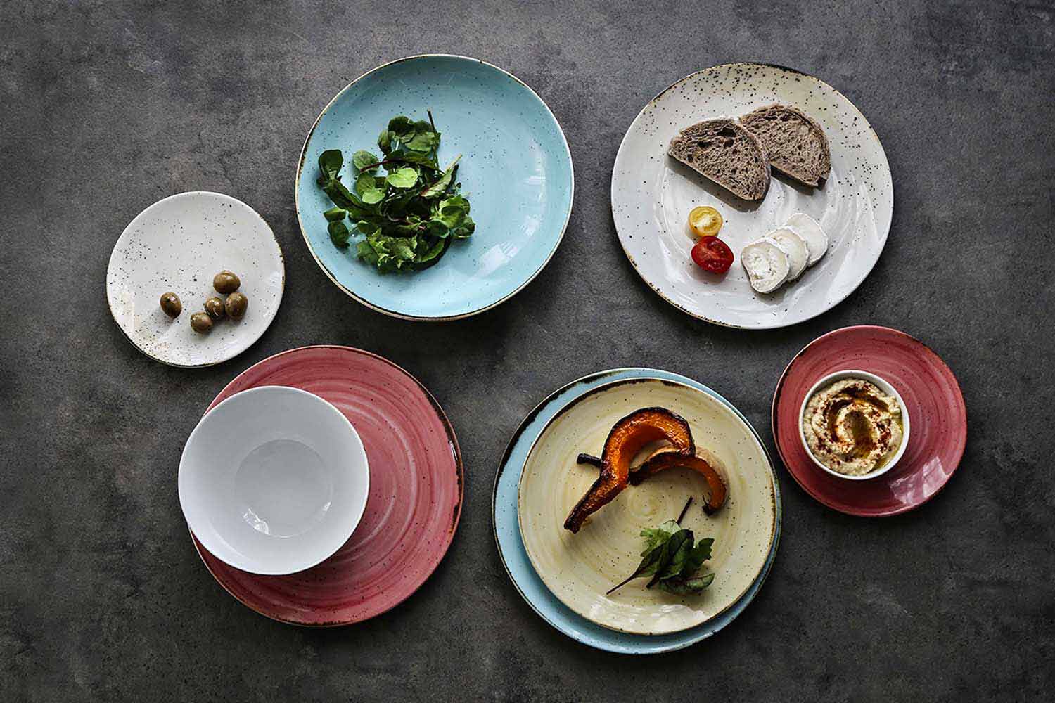 Teller-Sets wird als einfach, elegant und raffiniert präsentiert, hergestellt aus Calcomania in verschiedenen Farben, für einen rustikalen und vielseitigen Stil.