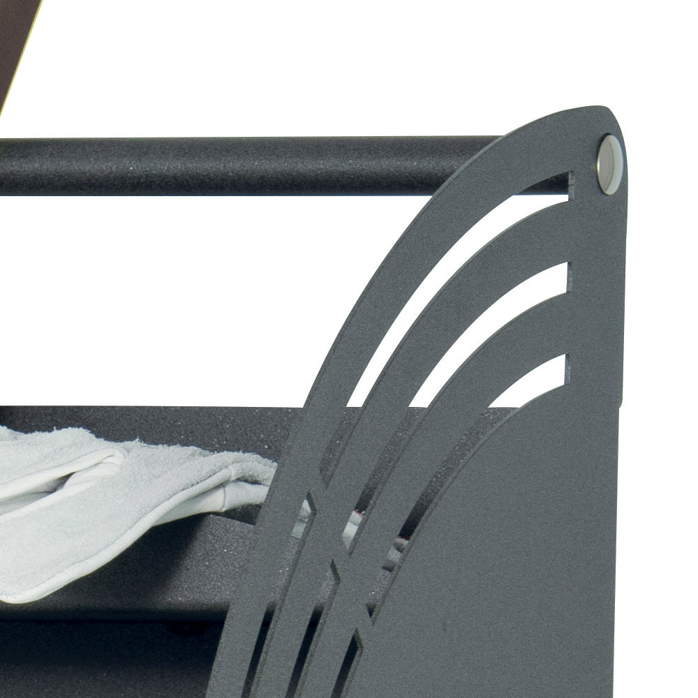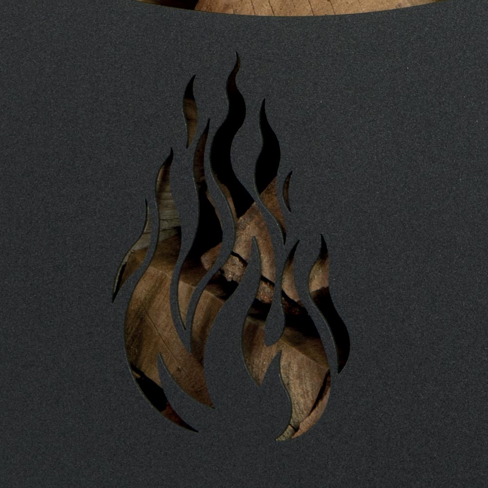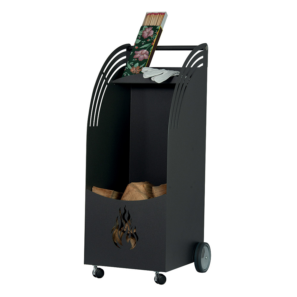 Der Wagen ist mit robusten Rädern ausgestattet, die eine einfache Mobilität ermöglichen und es Ihnen ermöglichen, Holz einfach und mühelos von einem Bereich zum anderen zu transportieren. Der Flammenschnitt an der Frontplatte wertet den Wagen nicht nur optisch auf, sondern fördert auch die Belüftung, die unerlässlich ist, um das Holz trocken und einsatzbereit zu halten.