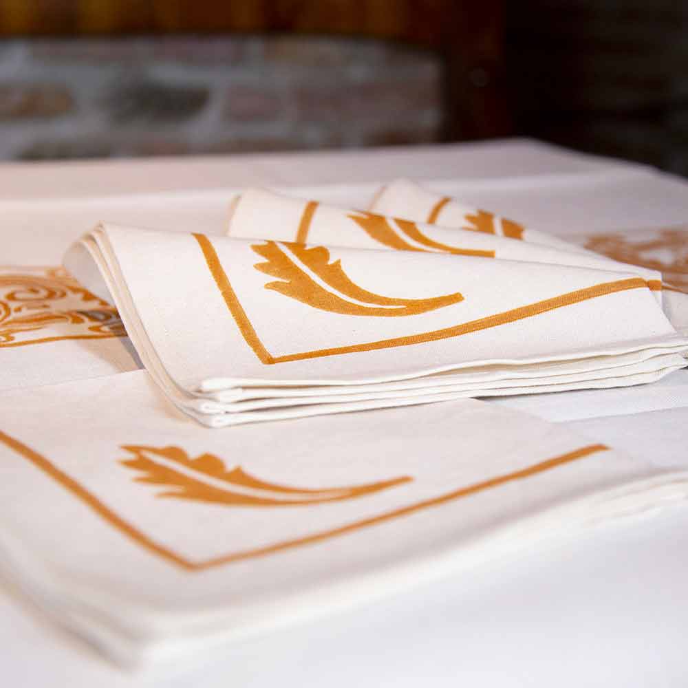 Tischserviette von hoher italienischer Handwerkskunst aus Leinen und Baumwolle, hergestellt mit alter Herstellungstechnik im künstlerischem Handabdruck auf feinen Stoffen, Rostfarbenes oder blaues Design, Unikate.