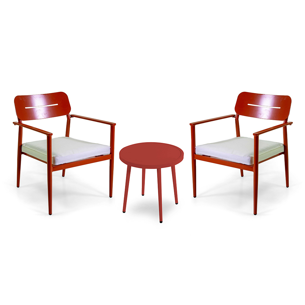 Der abgestimmte Tisch mit seinem essentiellen Design vervollständigt das Ensemble und bietet eine praktische Lösung zum Abstellen von Getränken oder Büchern, wodurch Ihr Außenbereich zu einer echten Erweiterung des Wohnbereichs wird, ideal für Momente der Entspannung oder zum Empfang von Gästen.