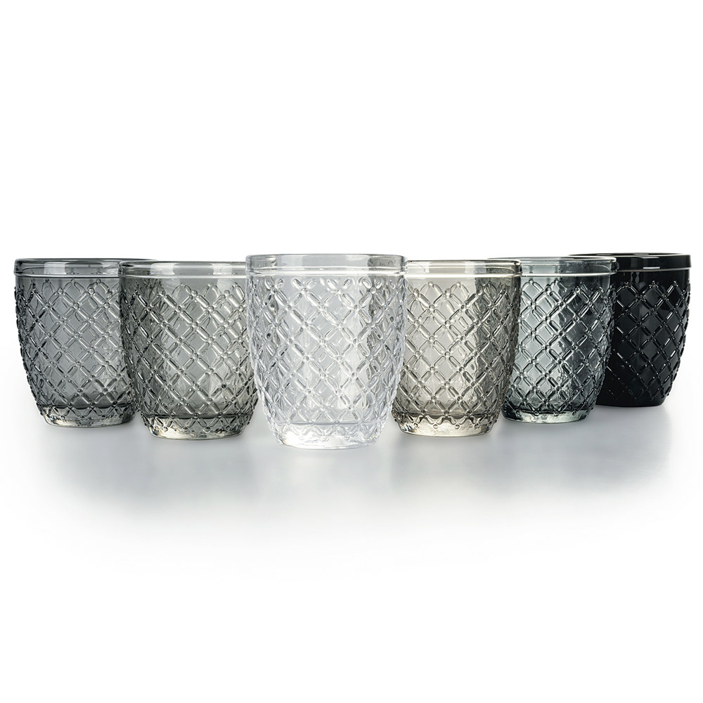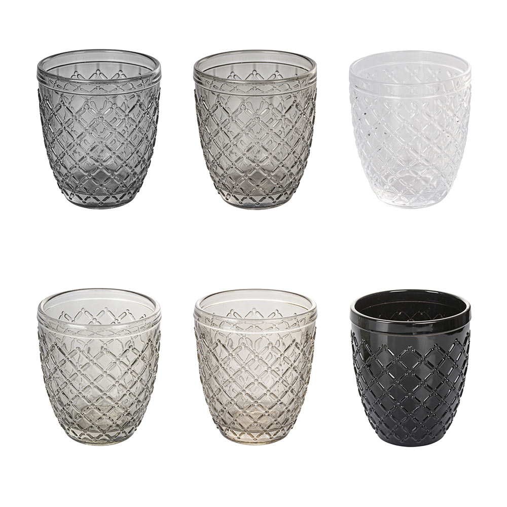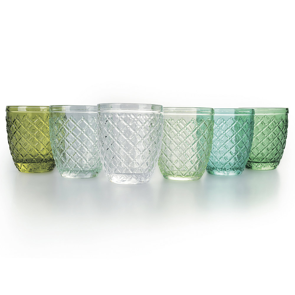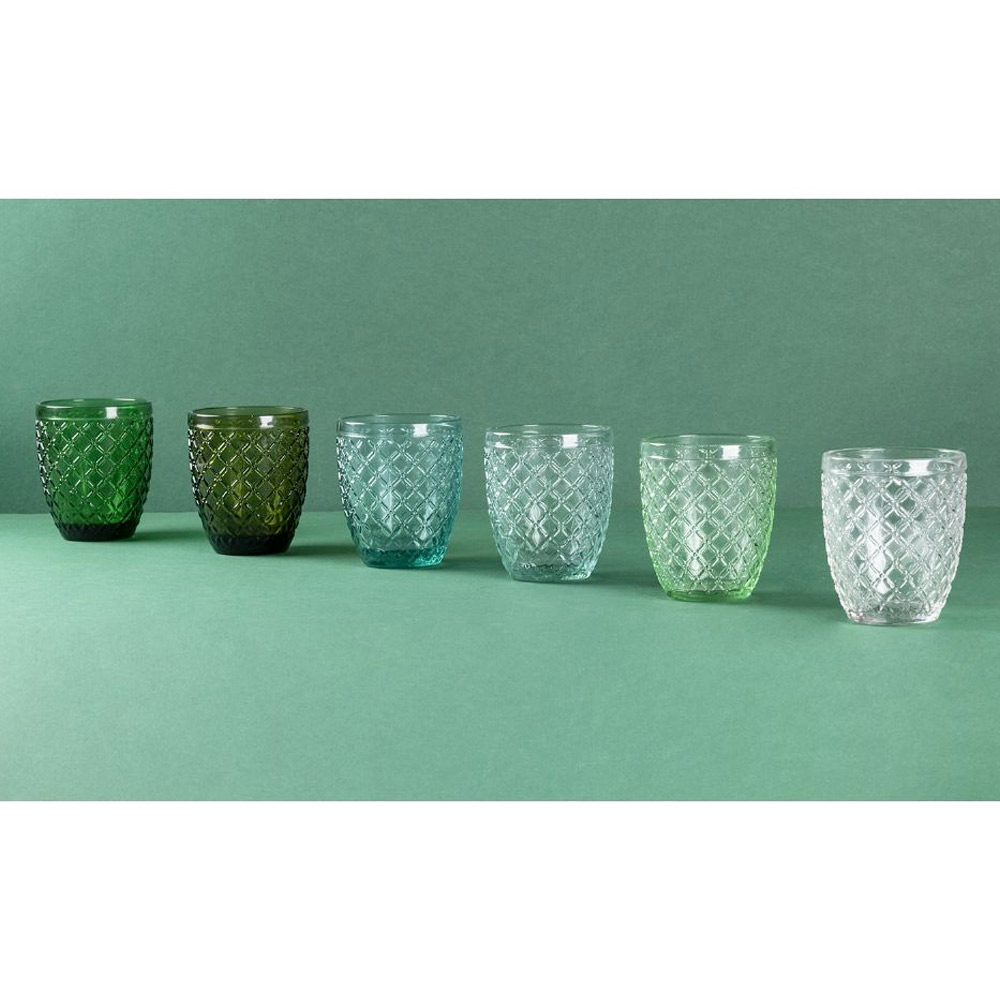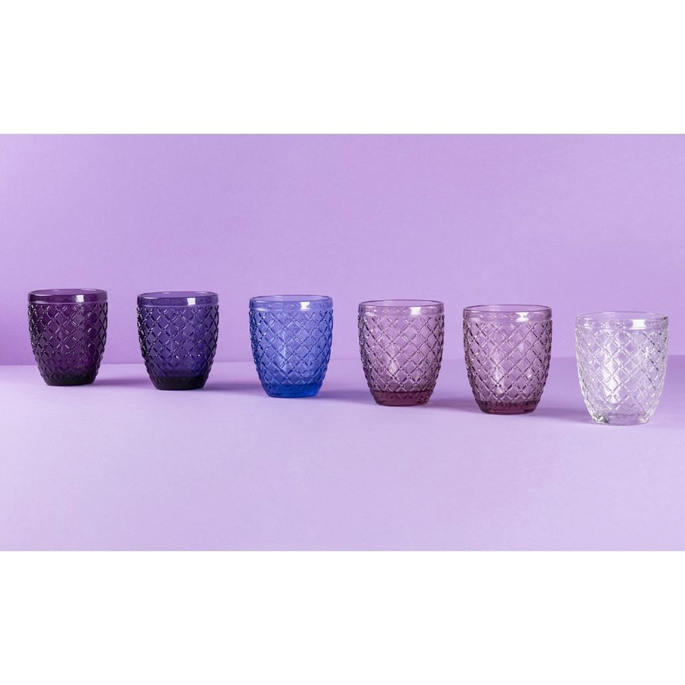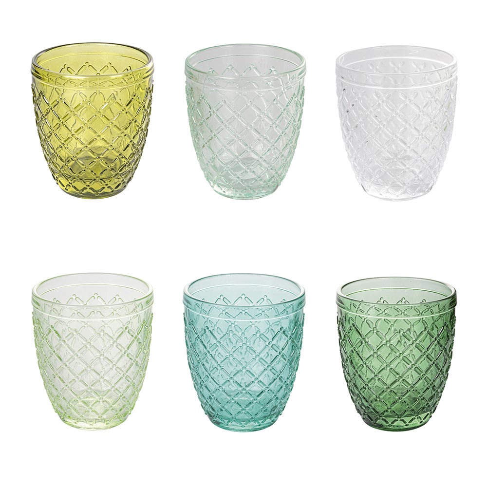 Entdecken Sie eine Welt voller Farben mit diesem Set aus 12 Gläsern , von denen jedes die Essenz einer Atmosphäre oder einer Tageszeit einfängt. Das Set enthält Gläser in den Farbtönen des goldenen Bernsteins der Morgensonne, des intensiven Rots eines festlichen Abends und des üppigen Grüns , das an üppige Weiden erinnert. Die Serie wird fortgesetzt mit dem heiteren Blau des Nachmittagshimmels, dem raffinierten Violett der sternenklaren Nacht und dem kristallklaren Weiß des Mondlichts. Jedes Glas ist mit einem Wassertropfenmuster verziert, nicht nur für einen angenehmen visuellen Effekt, sondern auch für ein einzigartiges taktiles Erlebnis. Sie eignen sich perfekt für jeden Anlass, vom Frühstück über den Brunch bis zum abendlichen Aperitif, und verleihen jedem Tisch einen Hauch von Stil und Raffinesse . Wählen Sie dieses Set, um jeden Moment mit einem Hauch von Eleganz zum Leben zu erwecken.