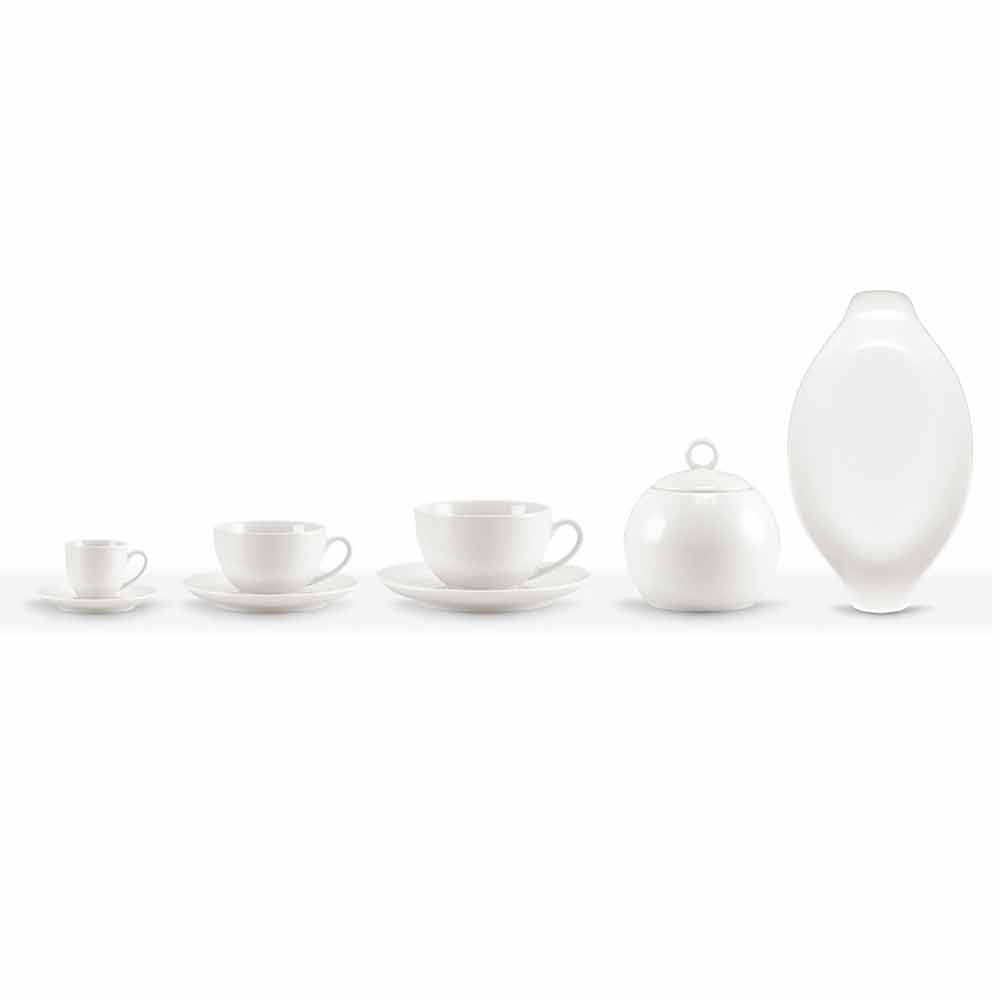 Service von Kaffeetassen, Tee, Frühstück mit Zuckerdose und Untertasse mit modernem Design aus weißem Porzellan, 20 Stück.