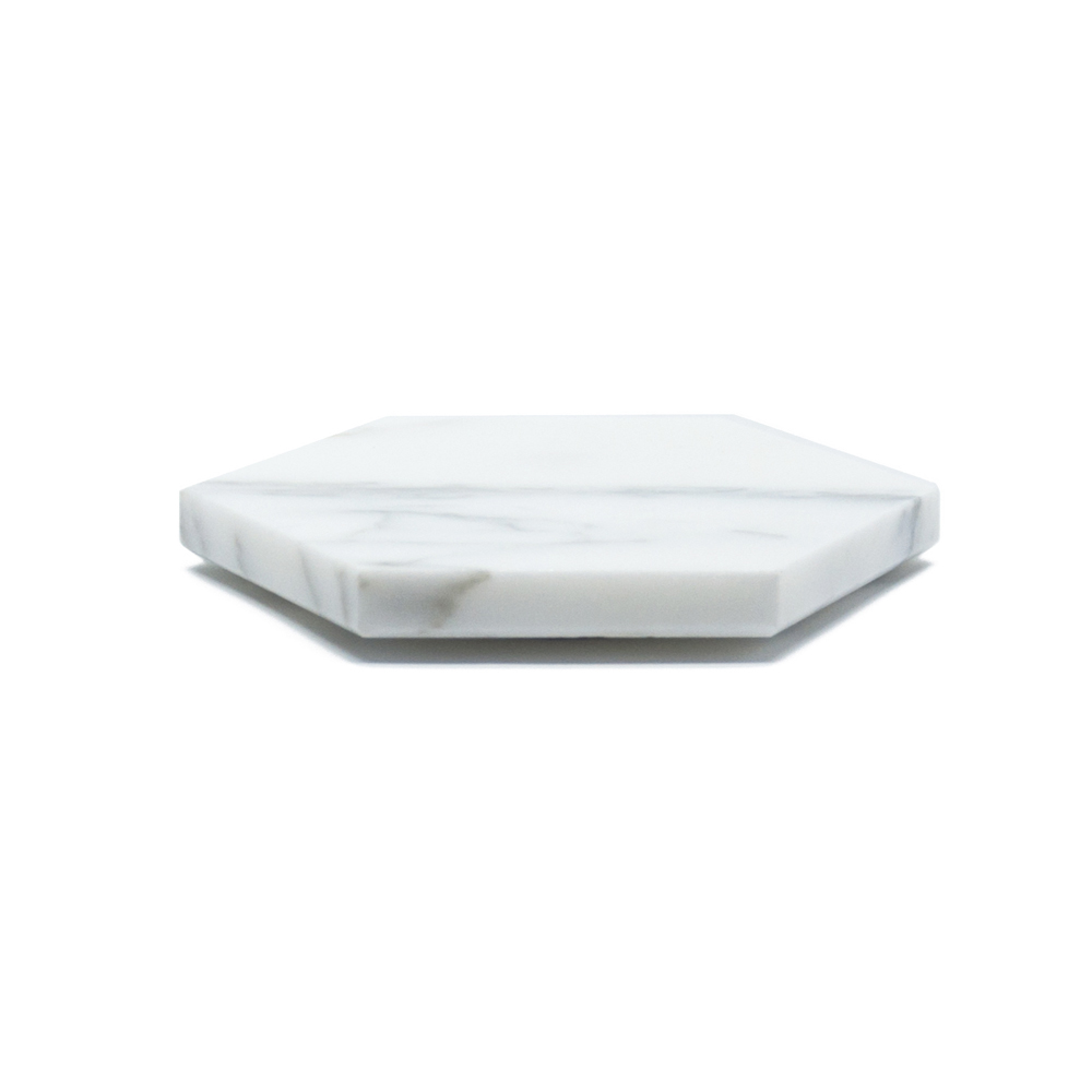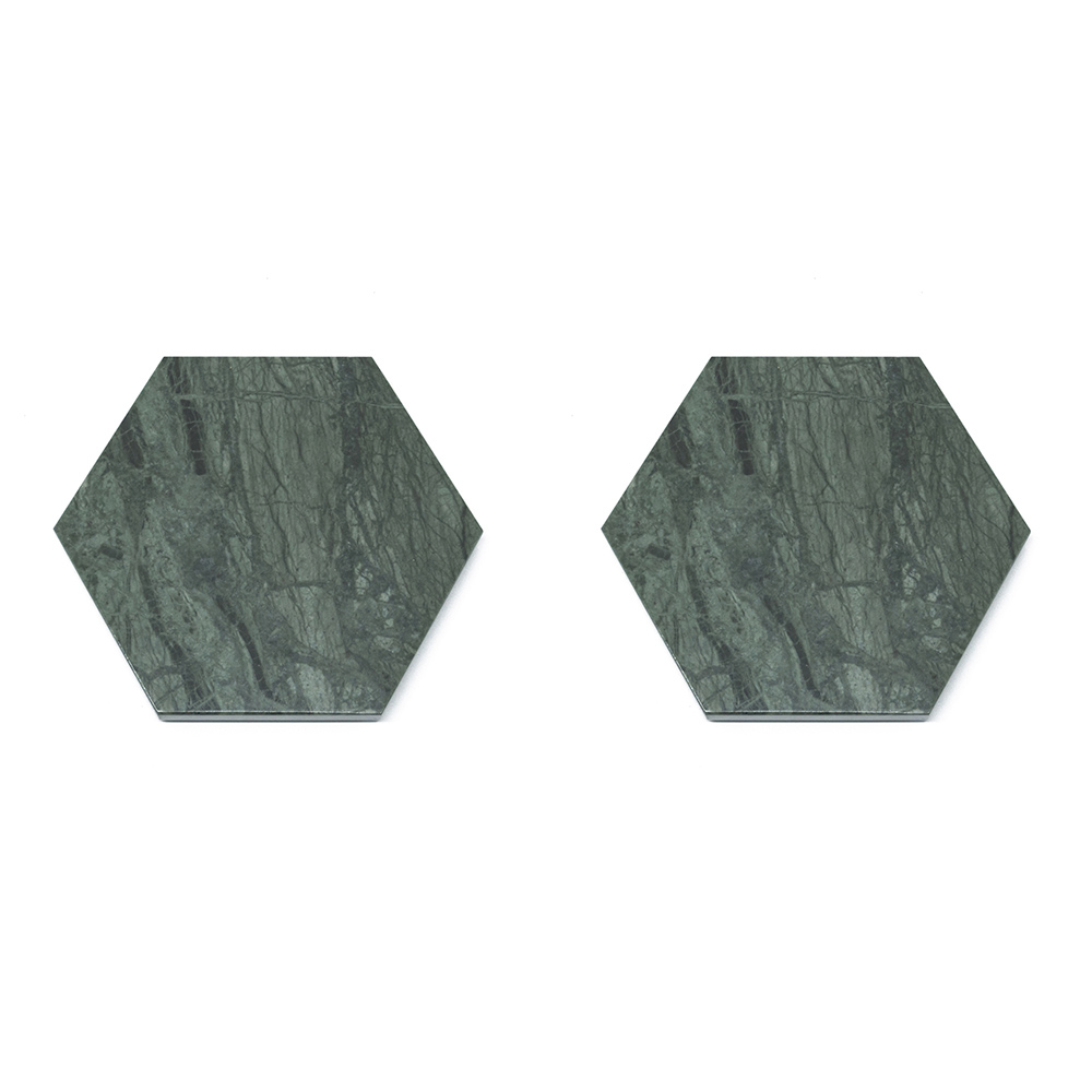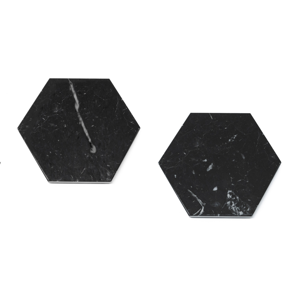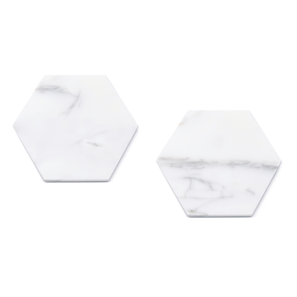 Diese Marmoruntersetzer sind ein Beispiel für funktionale Eleganz für das moderne Zuhause. In eine sechseckige Form geschnitten, ein geometrischer Genuss für die Augen, und mit den natürlichen und sich ständig verändernden Adern des Marmors verziert, sind diese Untersetzer nicht nur praktisch, sondern verleihen Ihrem Tisch auch einen Hauch von Eleganz .