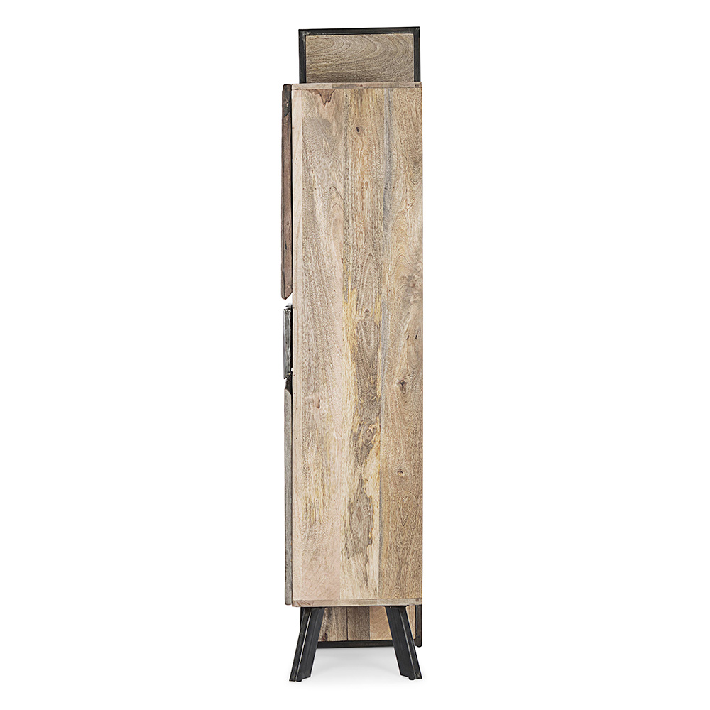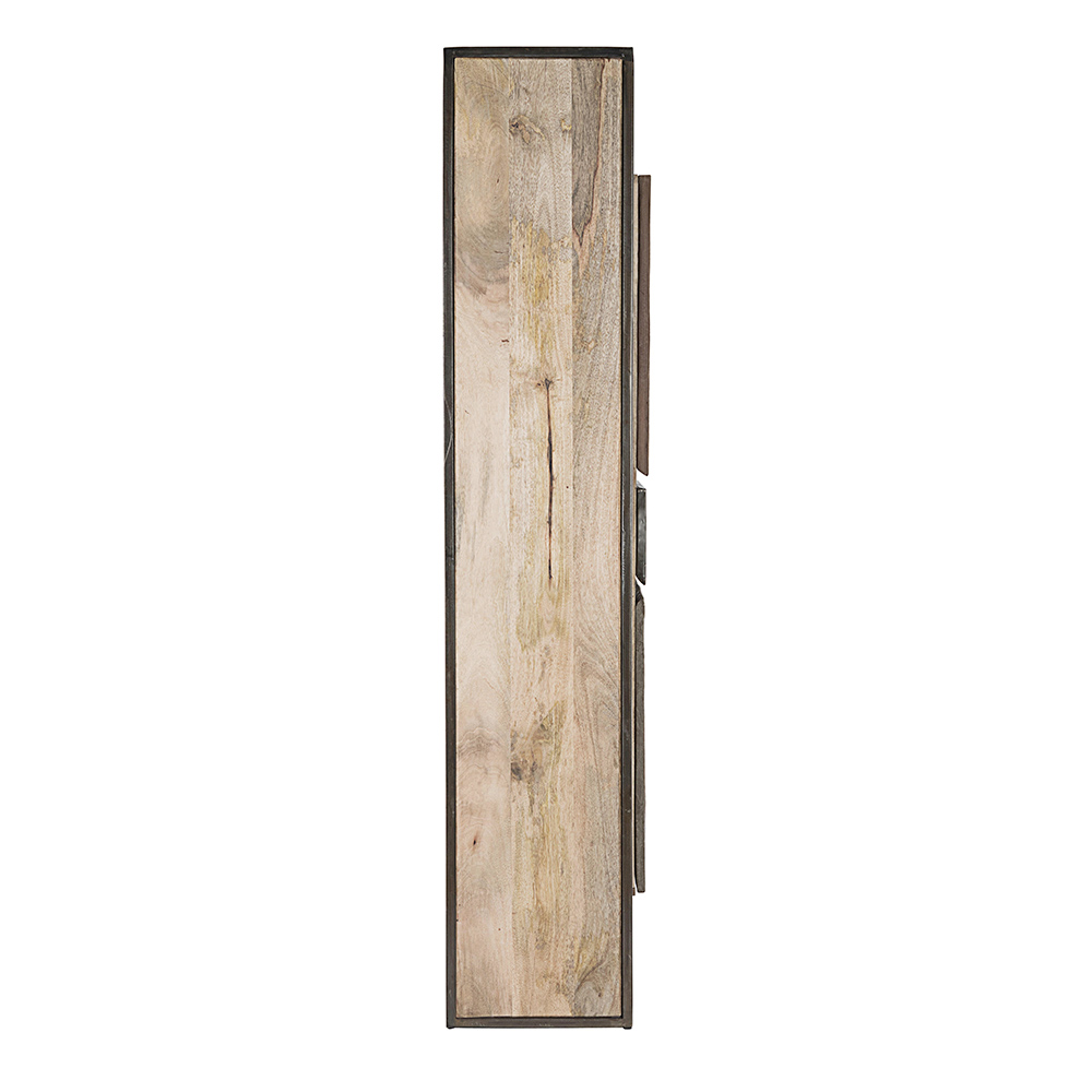 Dieses Design-Sideboard für das Wohnzimmer hat eine Struktur aus Mangoholz und Stahl mit einer Rückseite aus Sperrholz.