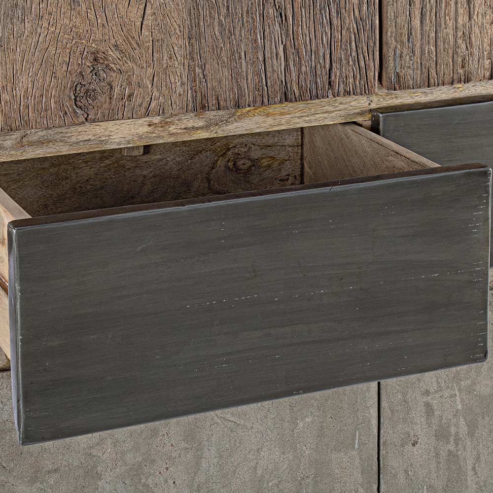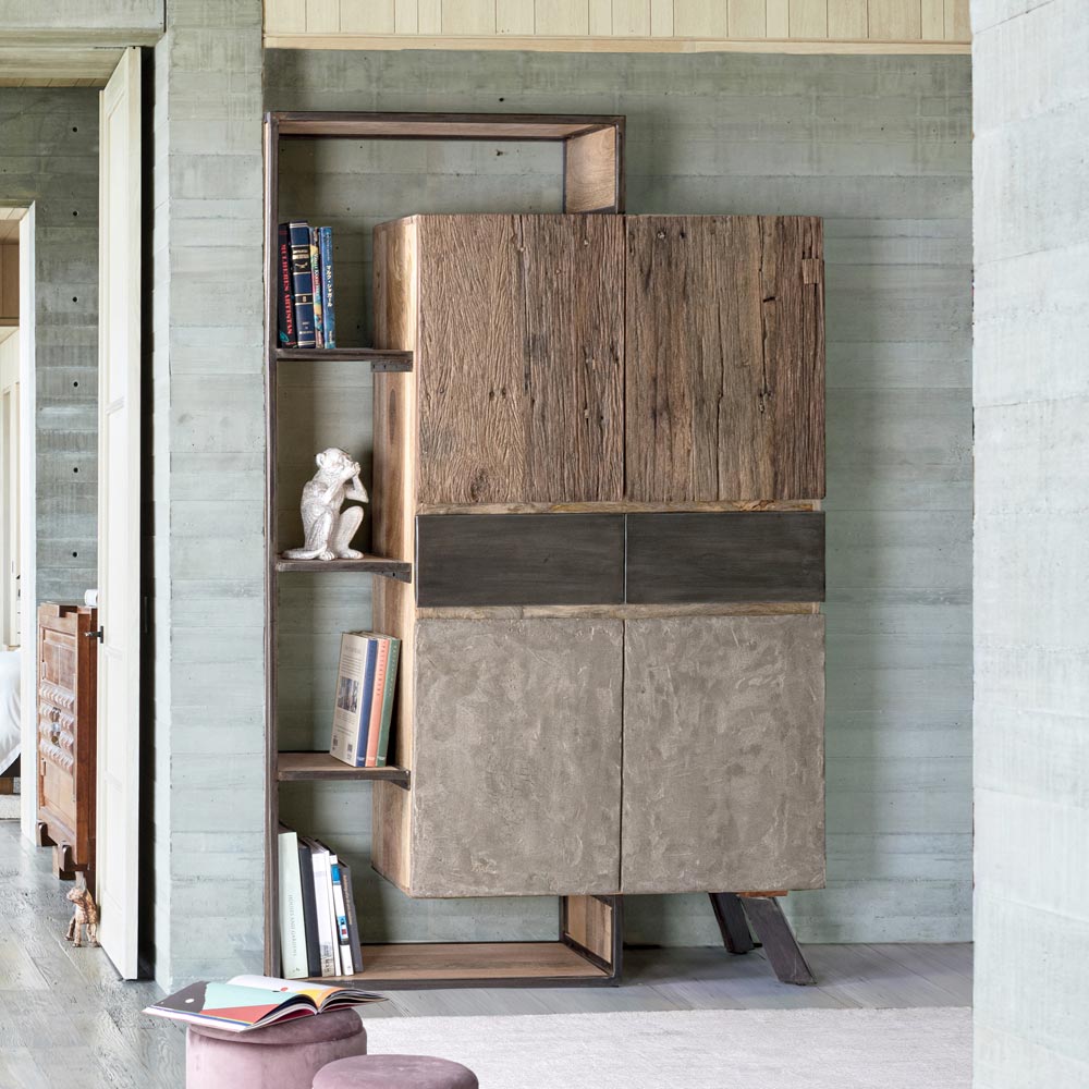 Die 4 Türen und die 2 Schubladen bestehen aus recyceltem Holz , Stahlblech und Zementfaser-Finish : Die Besonderheit des Möbelstücks besteht gerade im Vorhandensein von Holzdübeln verschiedener Arten und Farben.