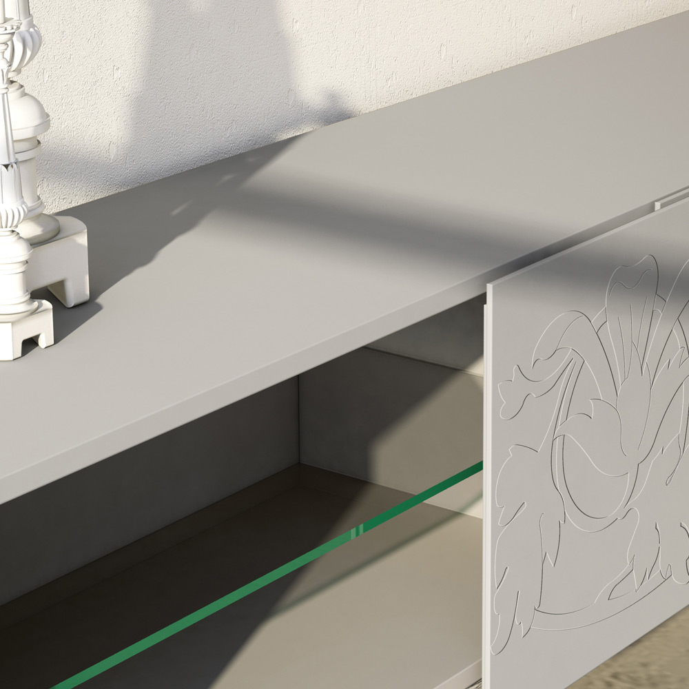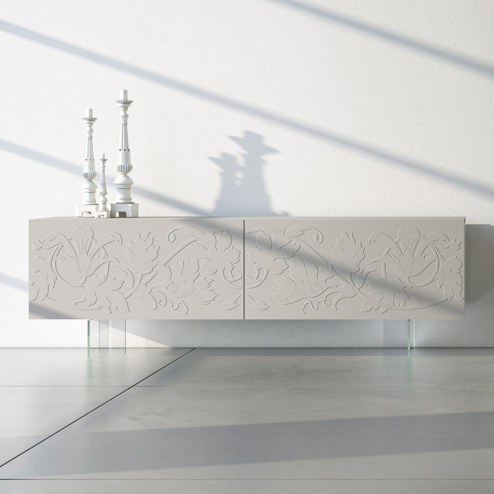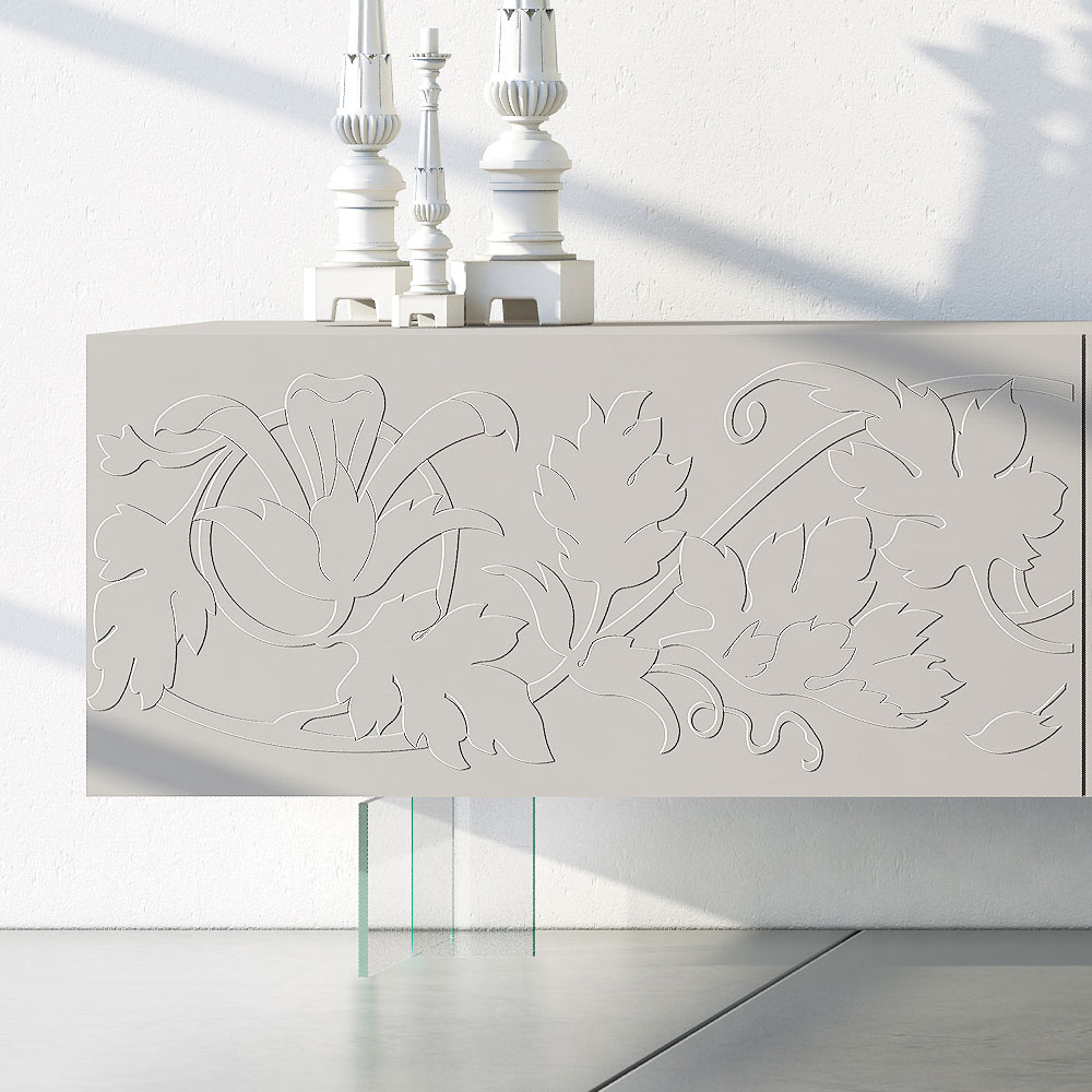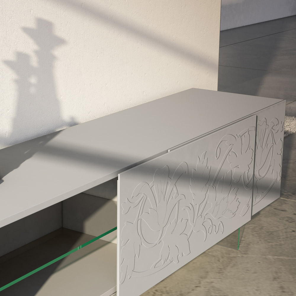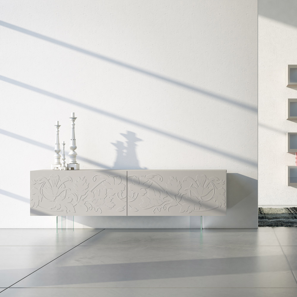 Modernes Sideboard mit weiß matt lackierter MDF- Struktur, bestehend aus 2 koplanaren Schiebetüren die große Funktionalität und Praktikabilität garantieren und mit extraklaren Glasfüßen . Dieses Produkt ist voller Geschmack und Design dank seiner eleganten und raffinierten Oberflächen und der einzigartigen Basrelief-Dekoration der Türen. Die verschiedenen Materialien, die für die Konstruktion verwendet werden, bieten eine hohe Qualität und Beständigkeit im Laufe der Zeit und verleihen dem Produkt eine einzigartige und unvergessliche Note.
