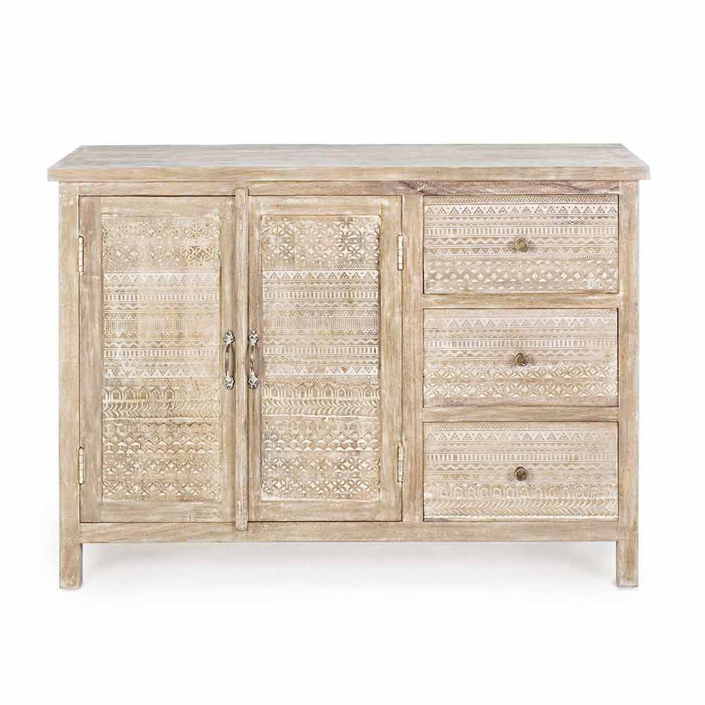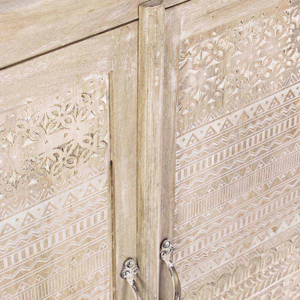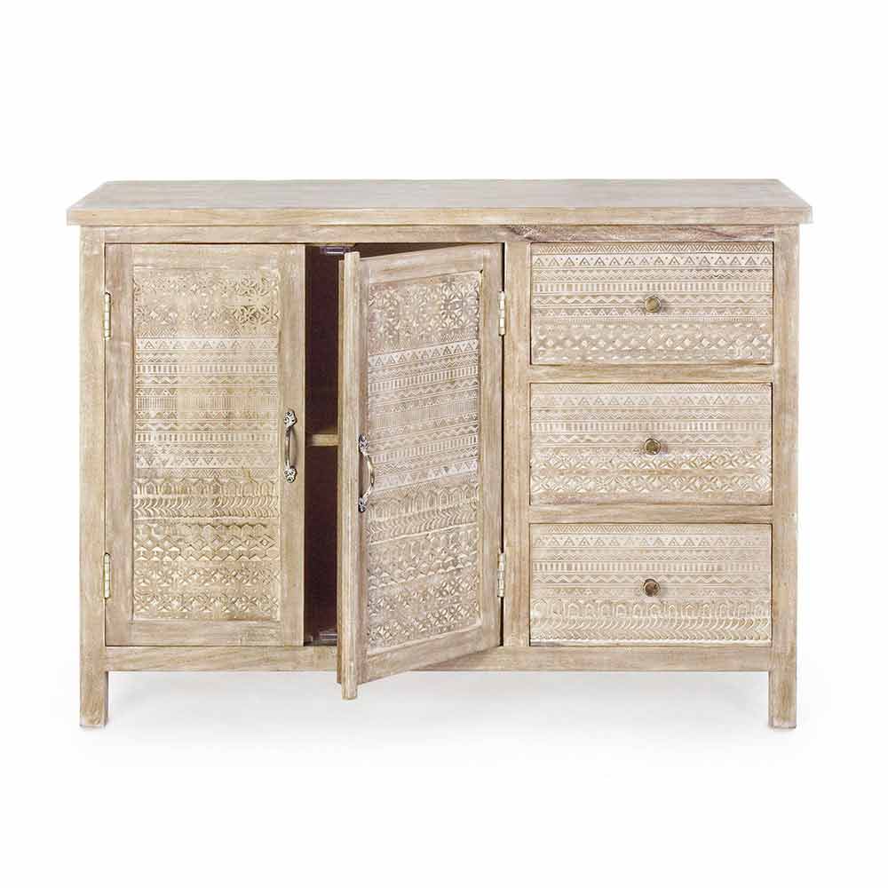 Struktur aus Mangoholz mit hand eingelegten Verzierungen, Rücken- und Bodenschubladen in mdf . Veredelung auf Nitrocellulosebasis.