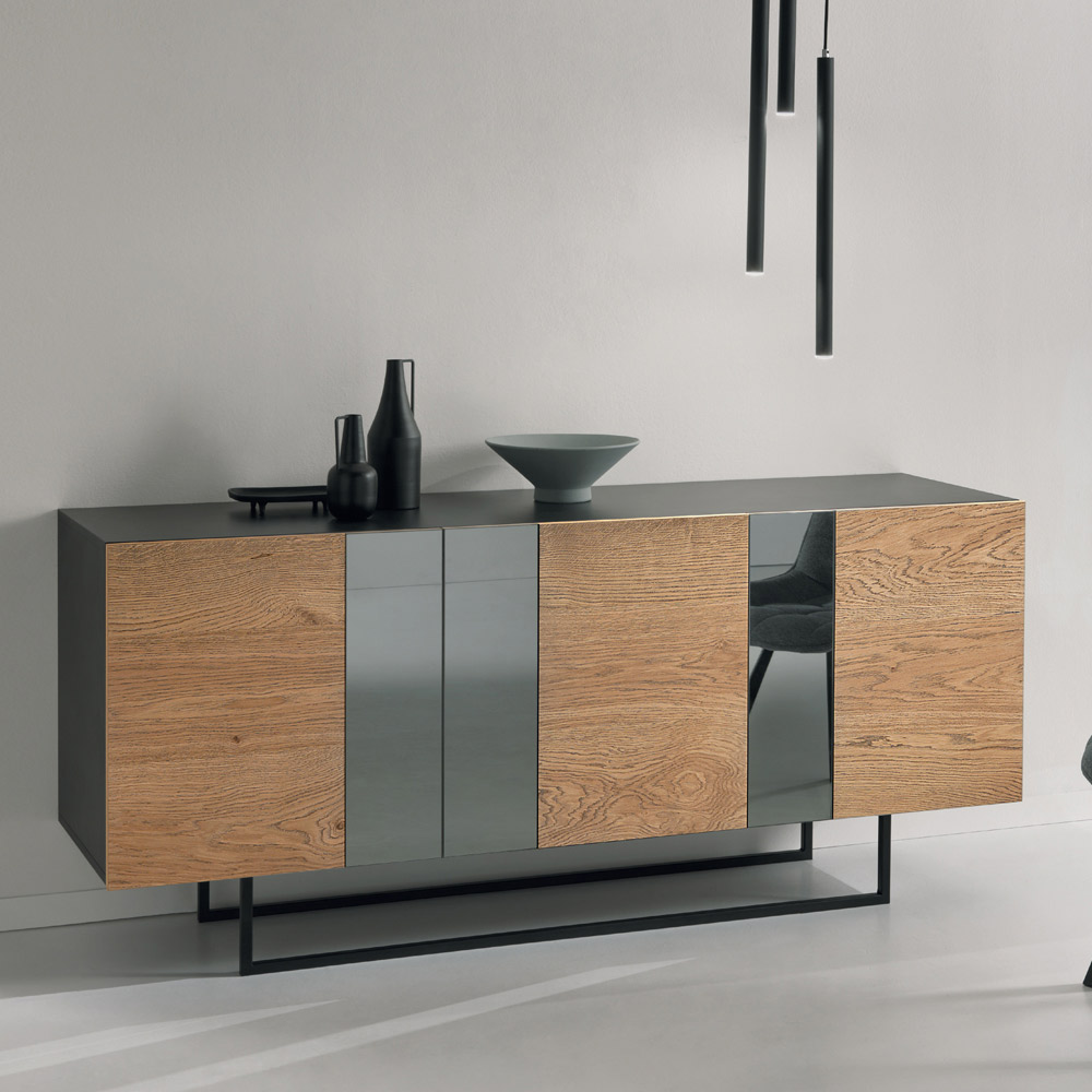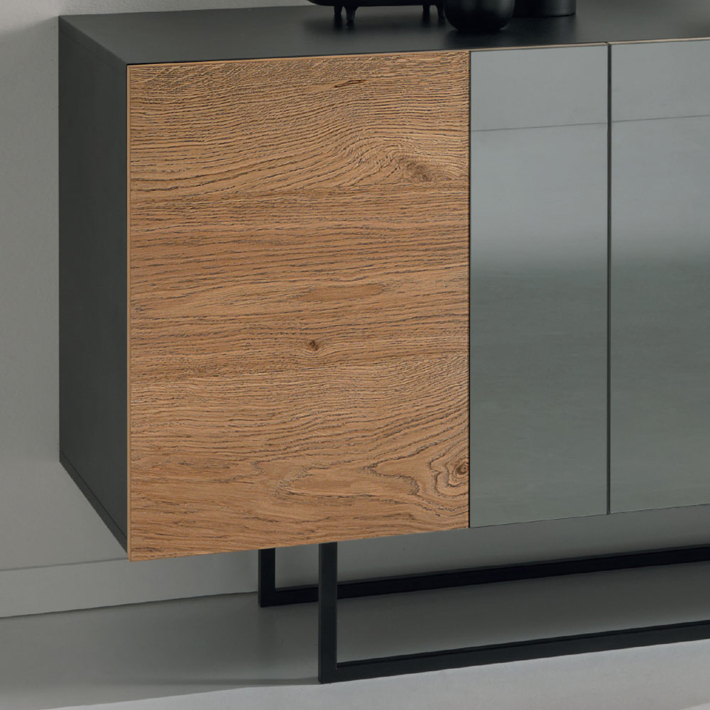 Modernes Sideboard mit Struktur aus Melamin in Anthrazit , 3 Türen aus furnierter Eiche , angereichert durch elegante Einsätze geräucherter Spiegel und schwarz lackierte Metallfüße . Dieses wunderbare Dekorationselement für den Wohnbereich, das in einem Made in Italy- Produktionsprozess mit erlesenen Rohstoffen hergestellt wird, bietet optimale Qualität , hervorragende Widerstandsfähigkeit und Stabilität sowie eine faszinierende und avantgardistische Ästhetik und erweist sich als perfekte Einrichtungslösung für diejenigen, die es lieben gleichzeitig ein elegantes und funktionales Möbelstück suchen.