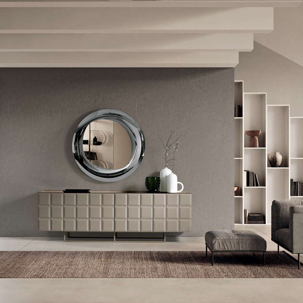 Der Korpus mit Melaminbeschichtung harmoniert mit dem lackierten Metallgestell , das in verschiedenen Ausführungen erhältlich ist. Dies sorgt für eine schlanke Silhouette und optische Leichtigkeit. Für einen noch eleganteren Effekt kann das Sideboard mit einer verspiegelten Glasplatte ausgestattet werden.
