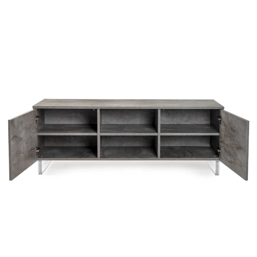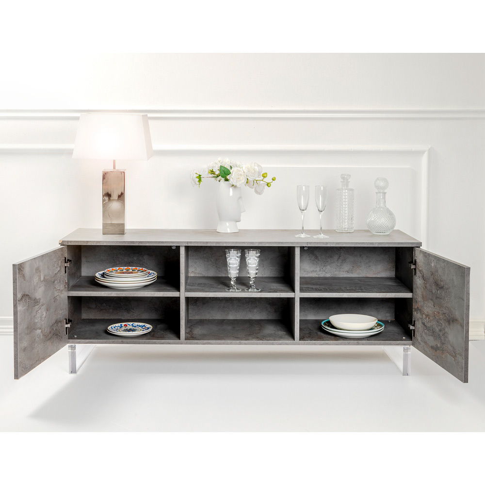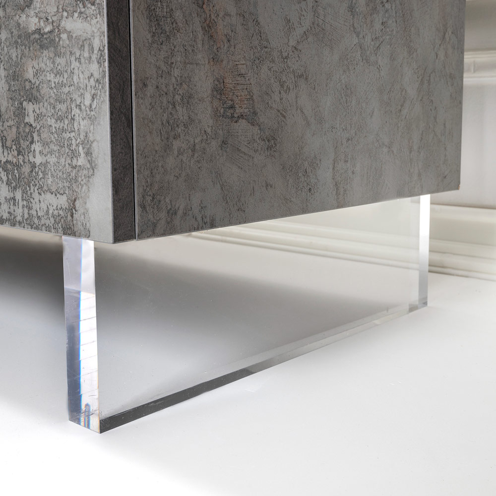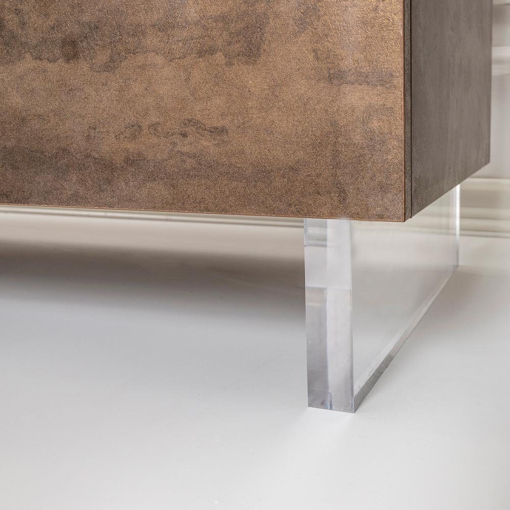 Auf transparenten Plexiglasfüßen aufgehängt, vermittelt dieses Sideboard die Illusion, im Raum zu schweben und sorgt für eine einzigartige und überraschende visuelle Leichtigkeit . Öffnen Sie die Flügeltüren und entdecken Sie einen geräumigen Innenraum mit Regalen, die darauf warten, Bücher, Gegenstände und Erinnerungsstücke unterzubringen, die alle mit maximaler Effizienz organisiert sind.