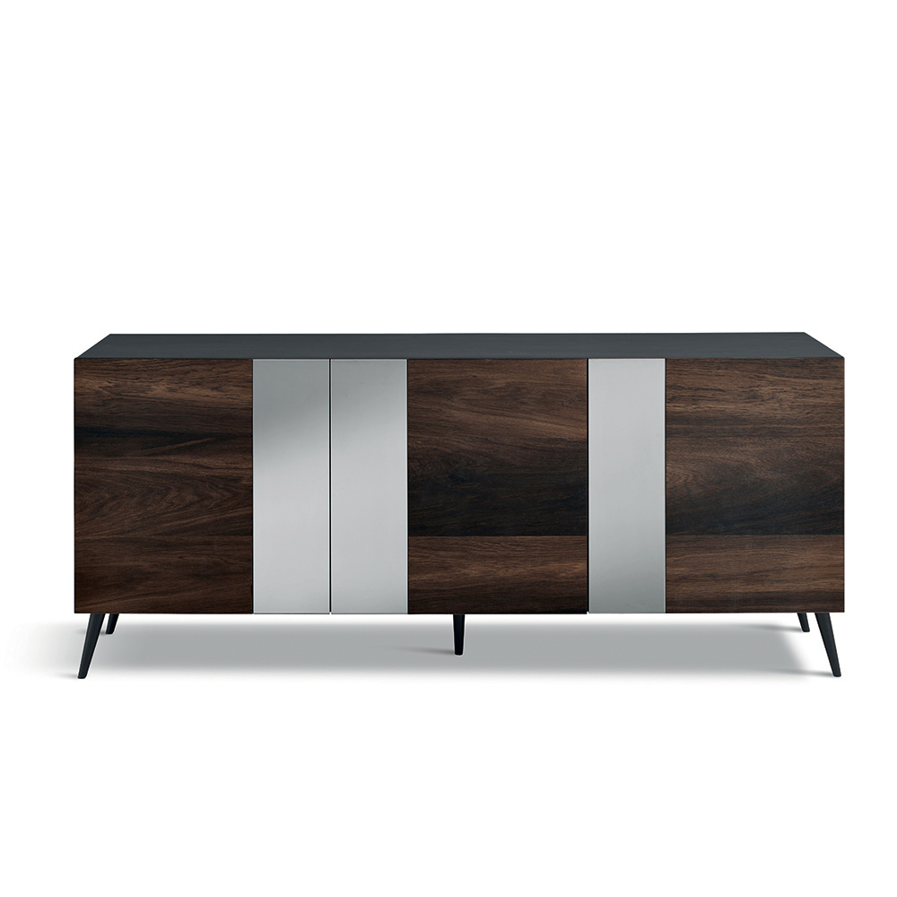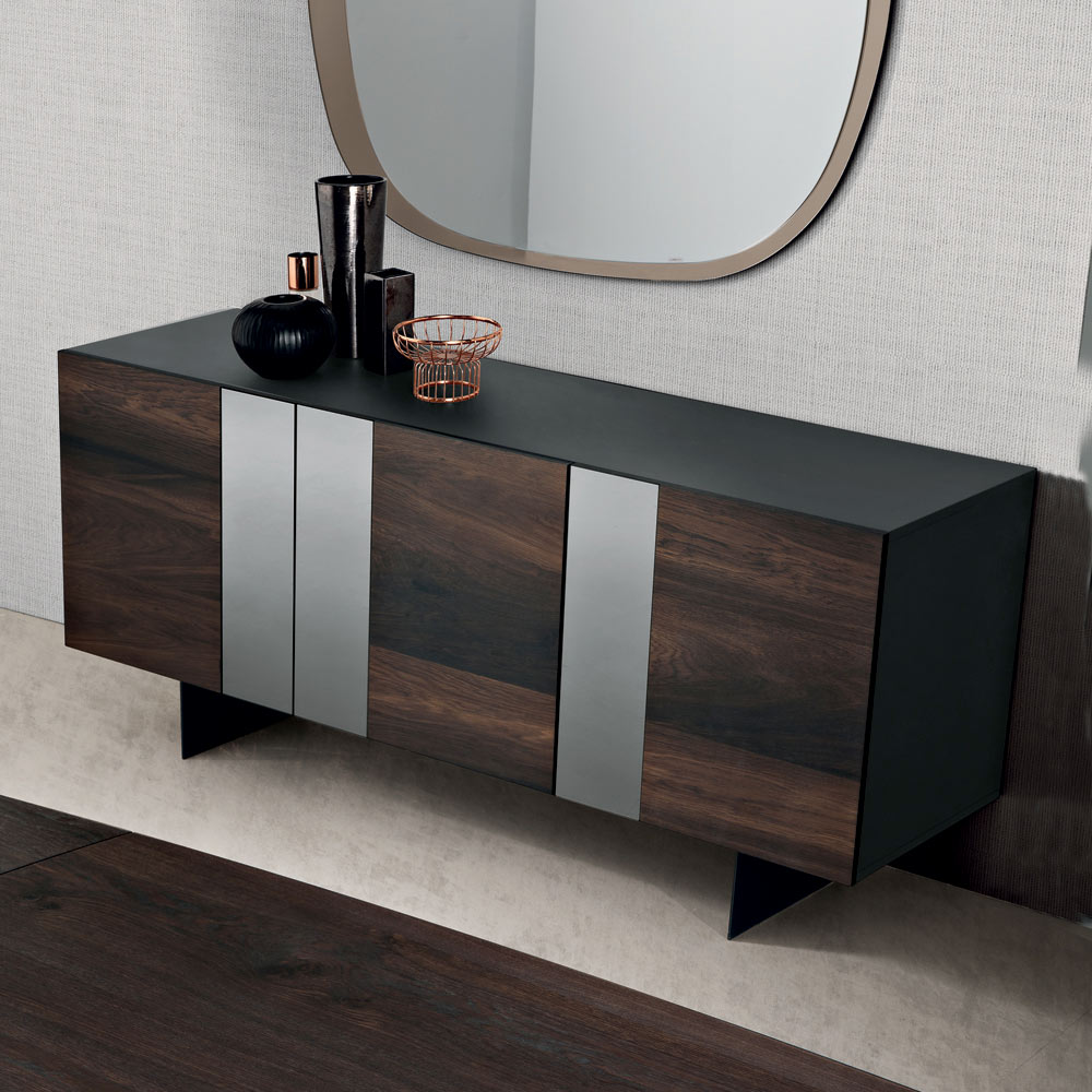 Der anthrazitfarbene, melaminbeschichtete Korpus beherbergt Türen aus Eichenfurnier , die durch vertikale Spiegelglaseinsätze optisch gegliedert werden. Dieser Kontrast zwischen der Holzstruktur und den Spiegelungen verleiht dem Sideboard Tiefe und Dynamik und macht es so elegant und lebendig.