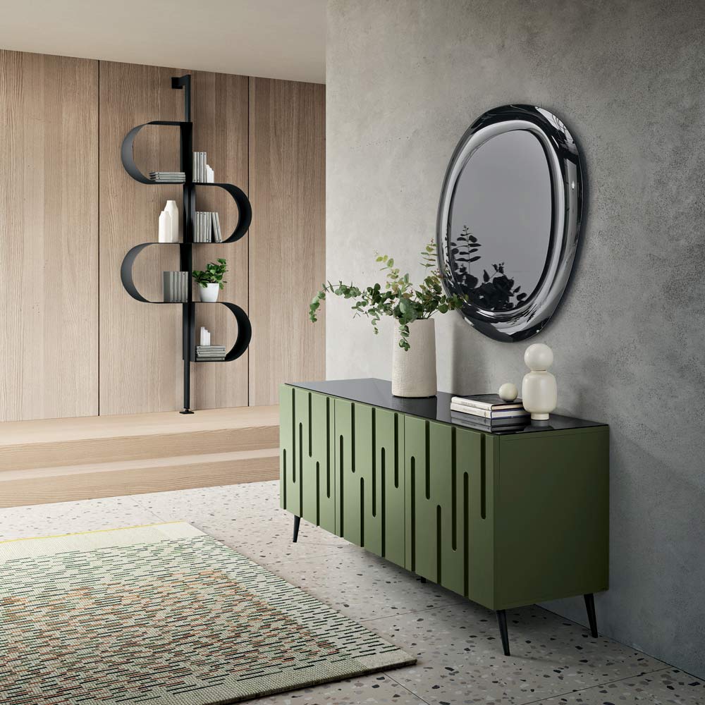 • Grüner Korpus mit grünen Türen und getöntem Spiegeldach – 5 schwarz lackierte Metallfüße, 130 x 38 x 20 cm