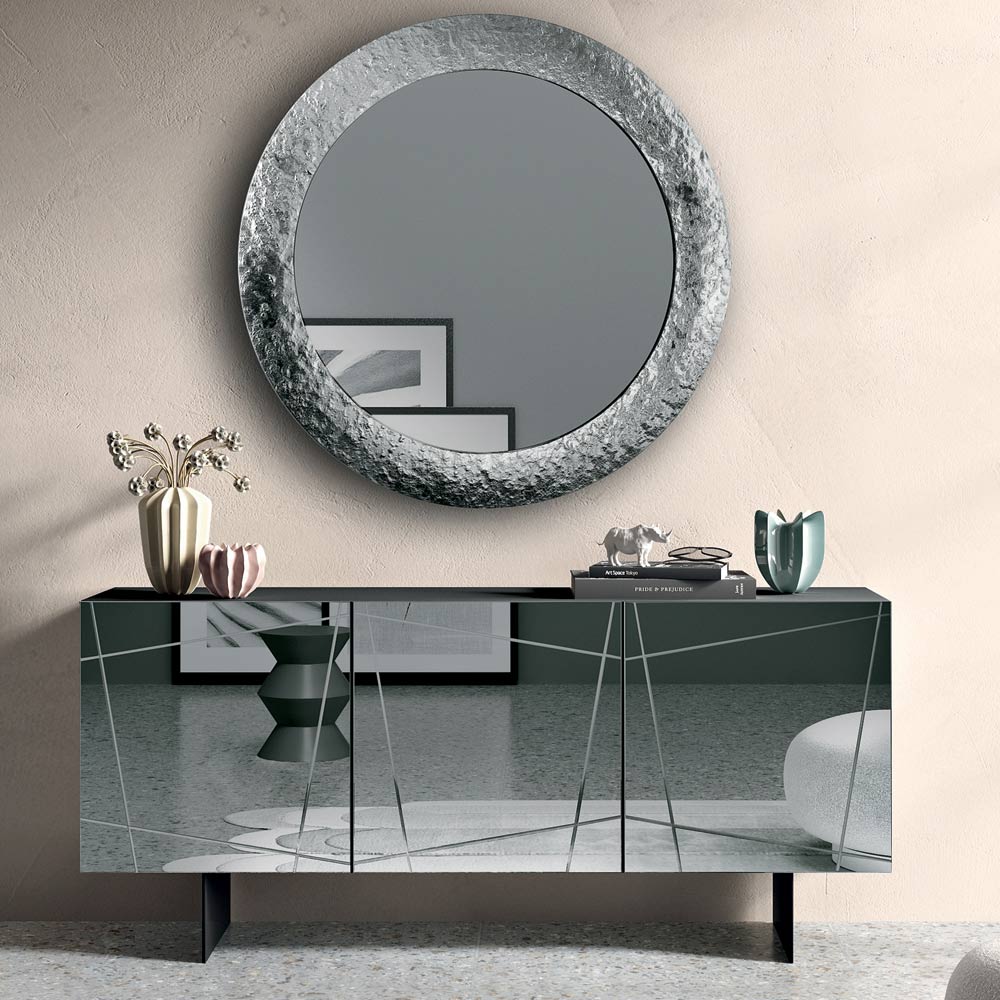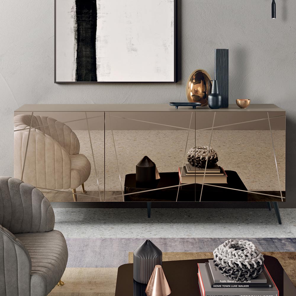 Der Korpus aus Melamin beherbergt Türen aus bronzefarbenem oder rauchfarbenem Spiegelglas , die mit dekorativen Gravuren verziert sind, welche sich zu einem eleganten grafischen Muster verweben. Dieses Detail verstärkt die reflektierende Oberfläche und erzeugt ein raffiniertes Spiel von Licht und Tiefe.