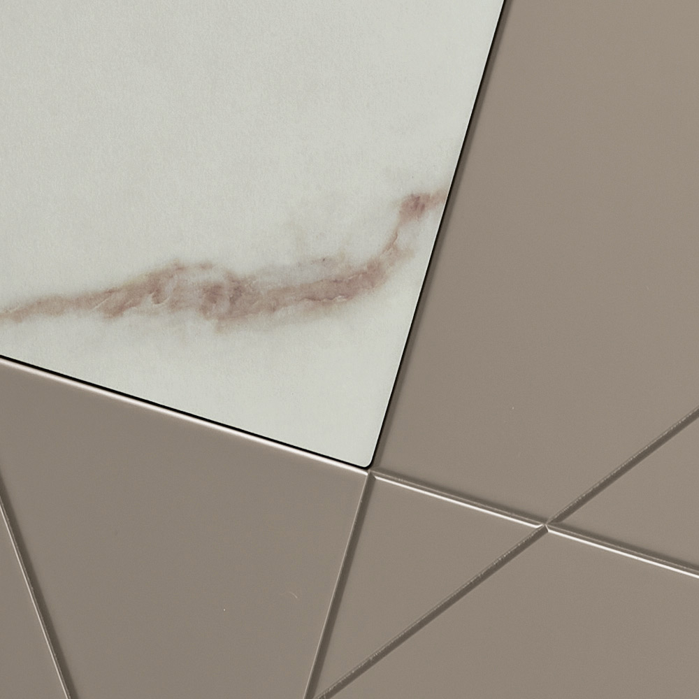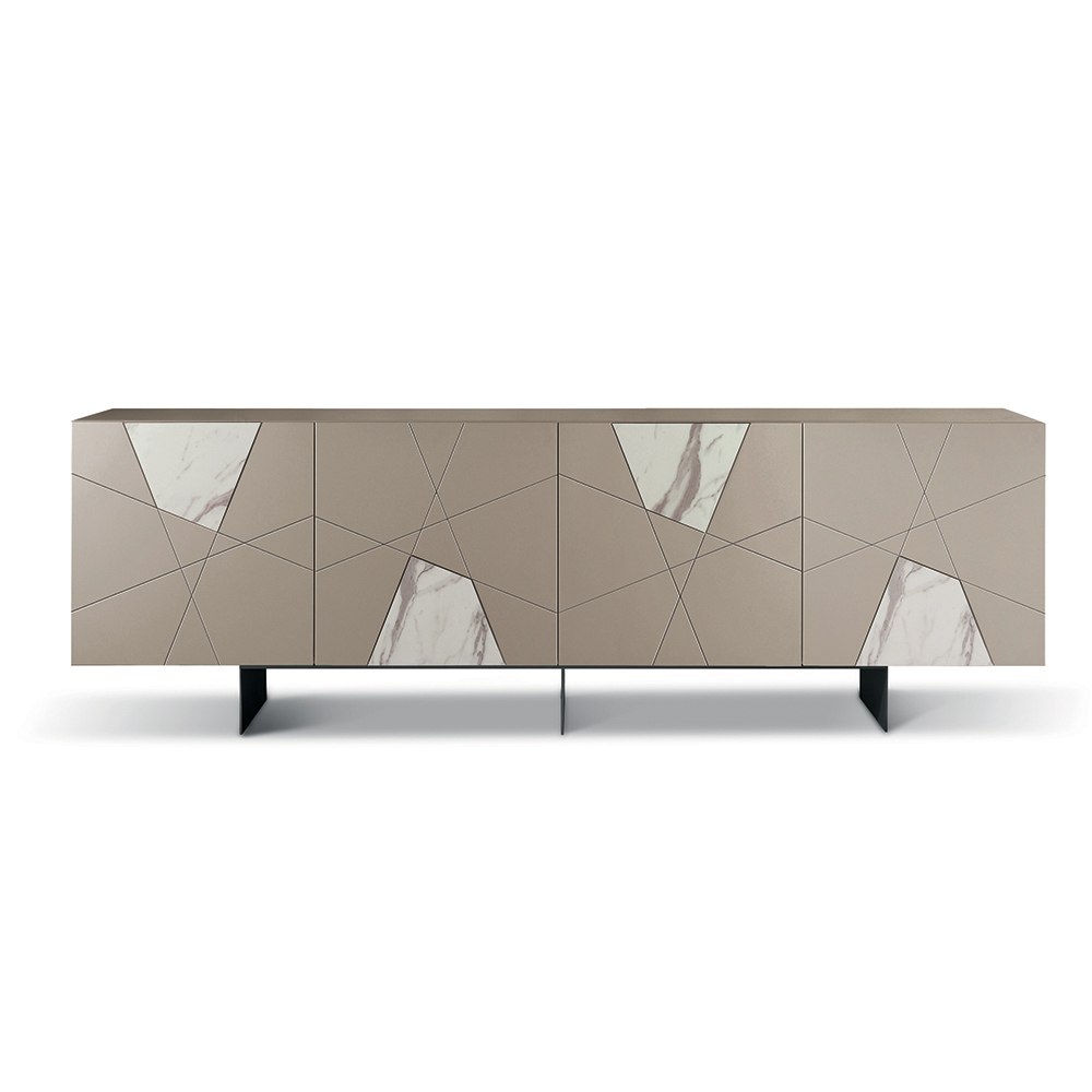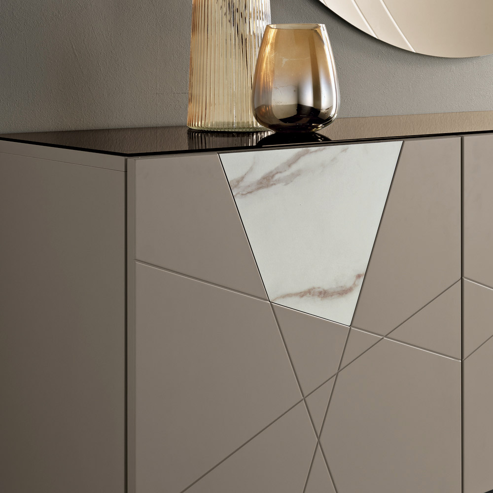 Die Konstruktion besteht aus einem melaminbeschichteten Holzkorpus, einer verspiegelten Glasplatte und pantografierten MDF-Türen mit dekorativen Gravuren, die sich zu einem eleganten geometrischen Muster verweben. Einsätze aus Glas in Marmoroptik bereichern die Oberfläche und erzeugen ein raffiniertes Zusammenspiel von Grafik und Material.