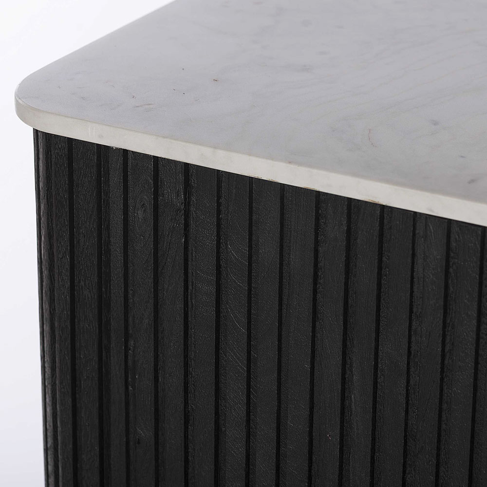 Dieses elegante Aufbewahrungsmöbel kombiniert modernes Design mit zeitloser Raffinesse und ist damit die perfekte Ergänzung für jeden anspruchsvollen Raum. Der schwarz geriffelte Holzrahmen erzeugt einen faszinierenden dreidimensionalen Effekt, der sofort ins Auge sticht und dem Möbelstück ästhetische Tiefe verleiht.