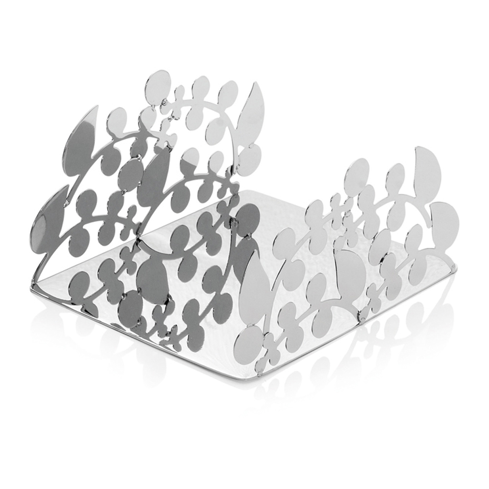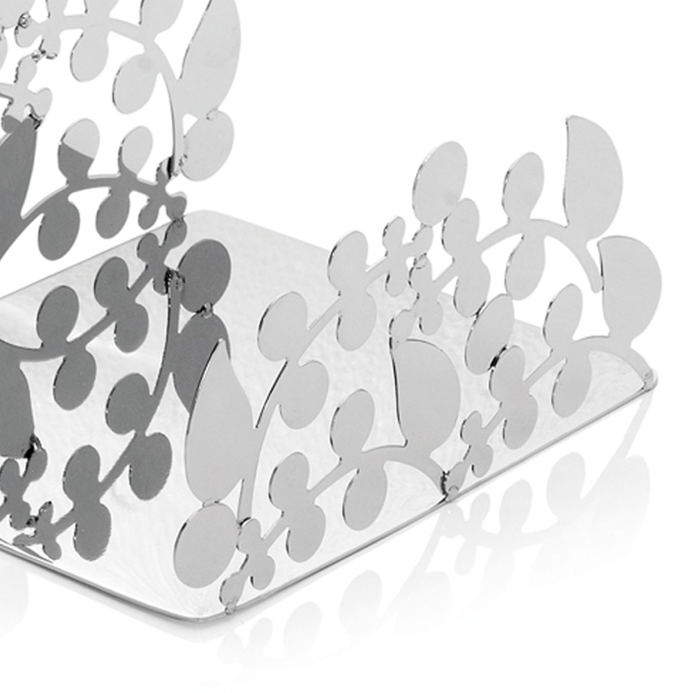 Dieser Serviettenhalter hat ein raffiniertes und elegantes rechteckiges Design , komplett aus silbernem Metall mit naturalistischen Verzierungen.
