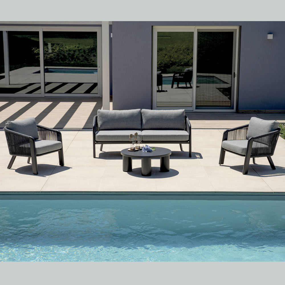 Mit ihrem harmonischen und vielseitigen Design passt sich diese Garnitur unterschiedlichen Umgebungen an und wird zum Herzstück jedes Außenbereichs, der der Entspannung gewidmet ist.