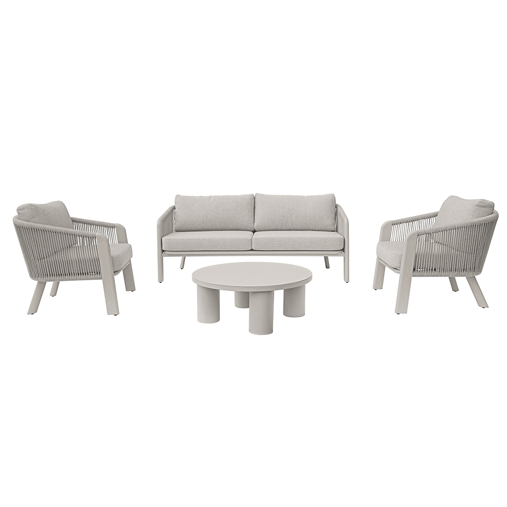 Das Aluminiumgestell sorgt für Leichtigkeit, Stabilität und Langlebigkeit, während das gewebte Seil Sitze und Rückenlehnen elegant umhüllt und so einen modernen und zugleich natürlichen optischen Effekt erzeugt. Die abnehmbaren Kissenbezüge gewährleisten maximalen Komfort und einfache Pflege und tragen dazu bei, dass das Wohnzimmer dauerhaft ein gepflegtes und stilvolles Erscheinungsbild behält.