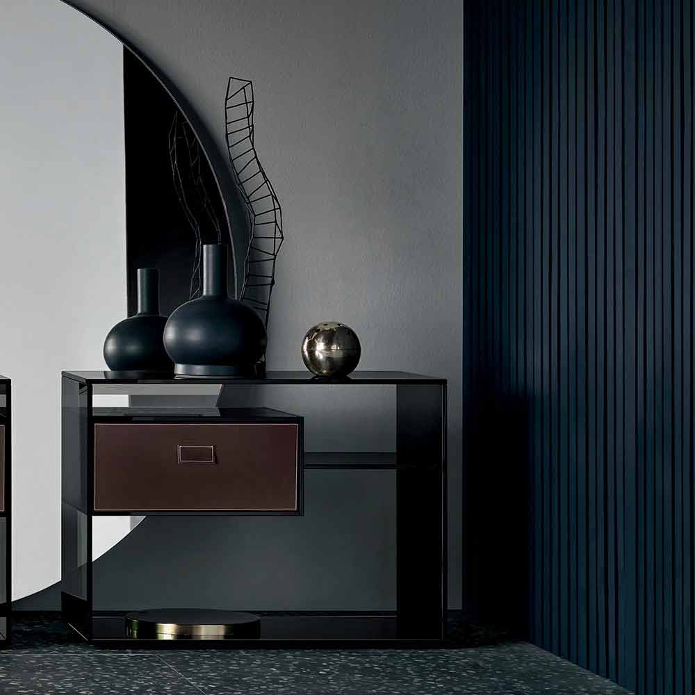Nachttisch aus Rauchglas mit Spiegelfuß und Lederschublade made in Italy.