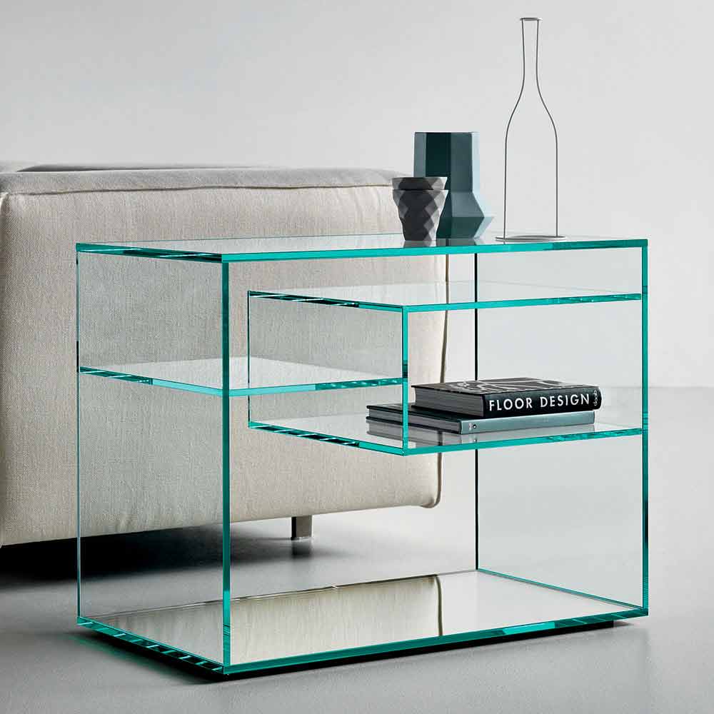 Dieser Sofa-Beistelltisch oder Nachttisch zeichnet sich durch sein vielseitiges , elegantes und minimalistisches Design aus, das vollständig aus extraklarem Glas mit Spiegelfuß besteht.