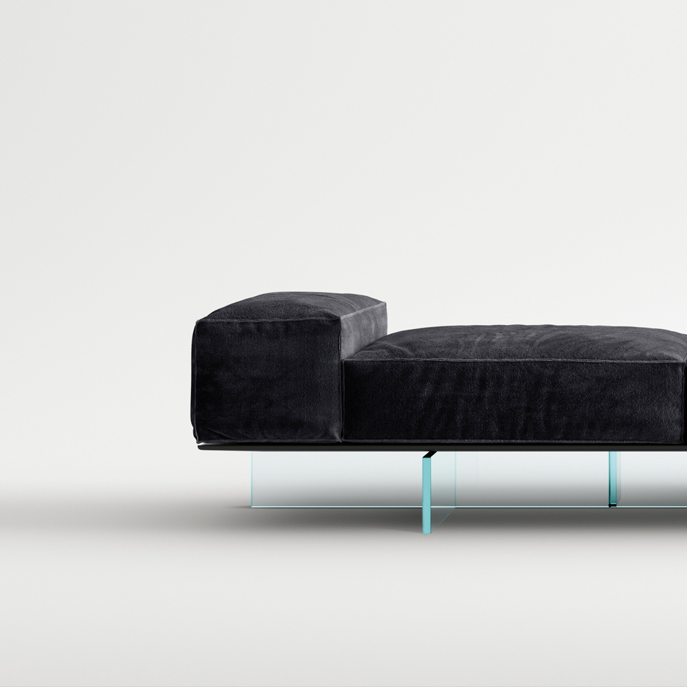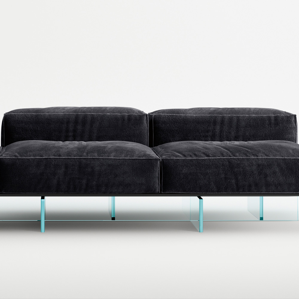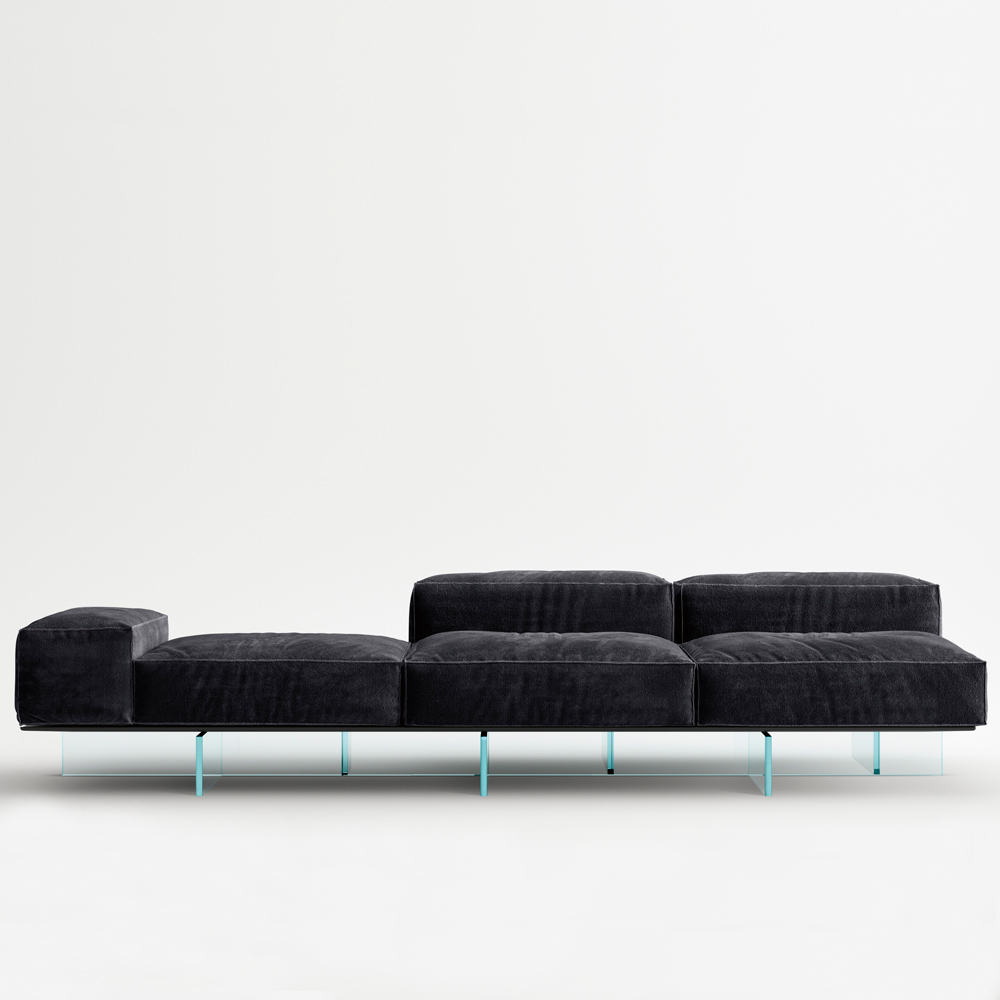 Das aus weichen und großzügig gepolsterten Volumen bestehende Sitzsystem eröffnet eine neue Art der Gestaltung des Wohnraums mit Elementen, die originelle, dynamischere und informellere Kompositionen ermöglichen. Das Sofa behält seine optische Leichtigkeit dank der Basis, die aus laminierten Glasfüßen besteht, die eine Holzplattform tragen, auf der die Polsterelemente ruhen. Hochwertige Stoffe und raffinierte Details in der Verpackung zeichnen ein Projekt mit unkonventionellem Charakter aus.