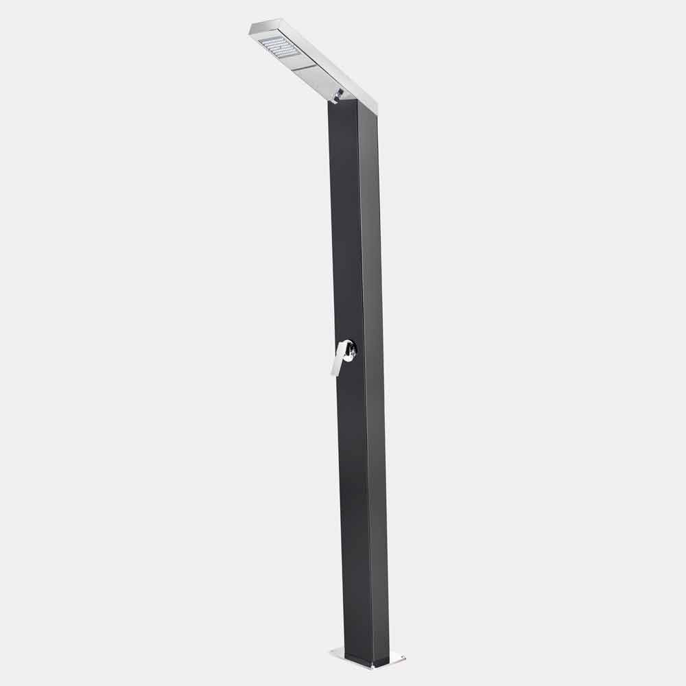 Dieses Produkt vereint die Eleganz seiner Formen und Linien mit hohem technischen Potenzial in jedem Außenbereich und ist somit die perfekte Duschsäule für den Außenbereich, die sowohl ästhetische als auch funktionale Ansprüche erfüllt. Die beiden Düsen, Regen- und Wasserfall, bieten eine wohltuende Massage und schaffen eine kleine, der Entspannung gewidmete Ecke in Außenbereichen wie Strandresorts und touristischen Einrichtungen, aber auch in privaten Bereichen wie Schwimmbädern und Gärten. Die rechteckige Struktur ermöglicht eine große Wärmeaufnahmefläche und hält das Wasser den ganzen Tag über warm. Daher ist es wichtig, die Dusche an einem offenen und besonders sonnigen Ort zu platzieren, damit die Sonnenstrahlen das Wasser im Tank optimal erwärmen können.