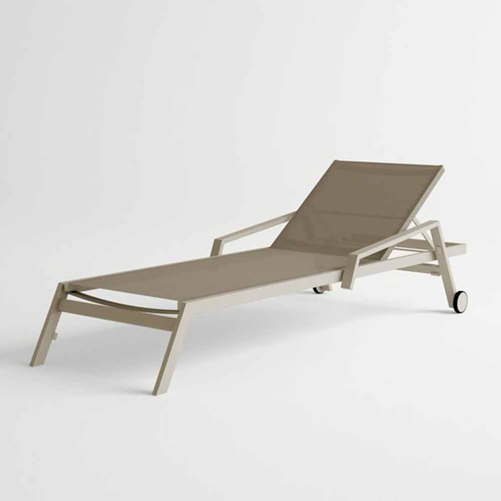 Sonnenbank im Freien, Aluminium- und Textilstruktur, modernes Design mit Rädern und Armlehnen.