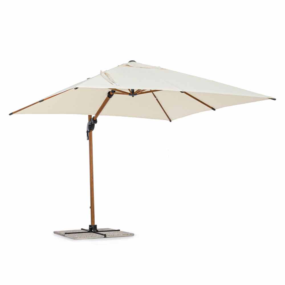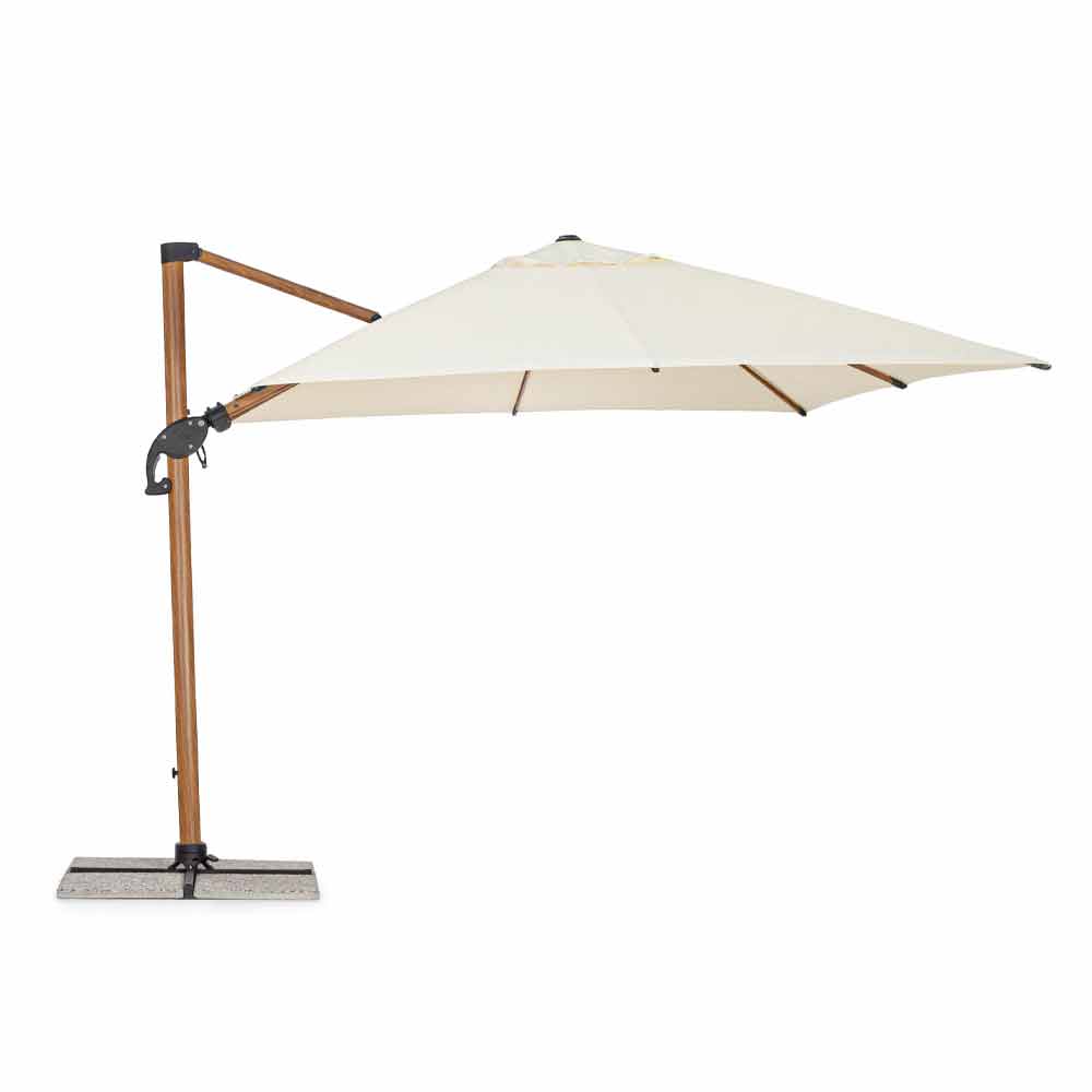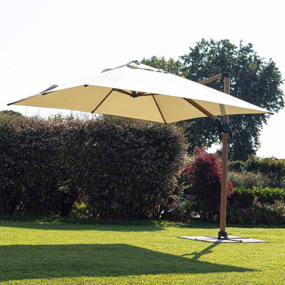 Pulverbeschichtete Aluminiumstruktur (Polyester) mit Holzeffekt. 90x60mm Stange, 8 25x17mm Rippen. Beigefarbenes Polyestergewebe 250 g / m2 mit Pa (Polyamid) -Beschichtung. Kreuzsockel aus Stahl . 360 ° drehbare Stange mit Pedal. Vertikale Neigung mit 6-Positionen-Griff. Ausgestattet mit Rechts-Links-Kippsystem für Regenschirm. Inklusive Regenschirmabdeckung.