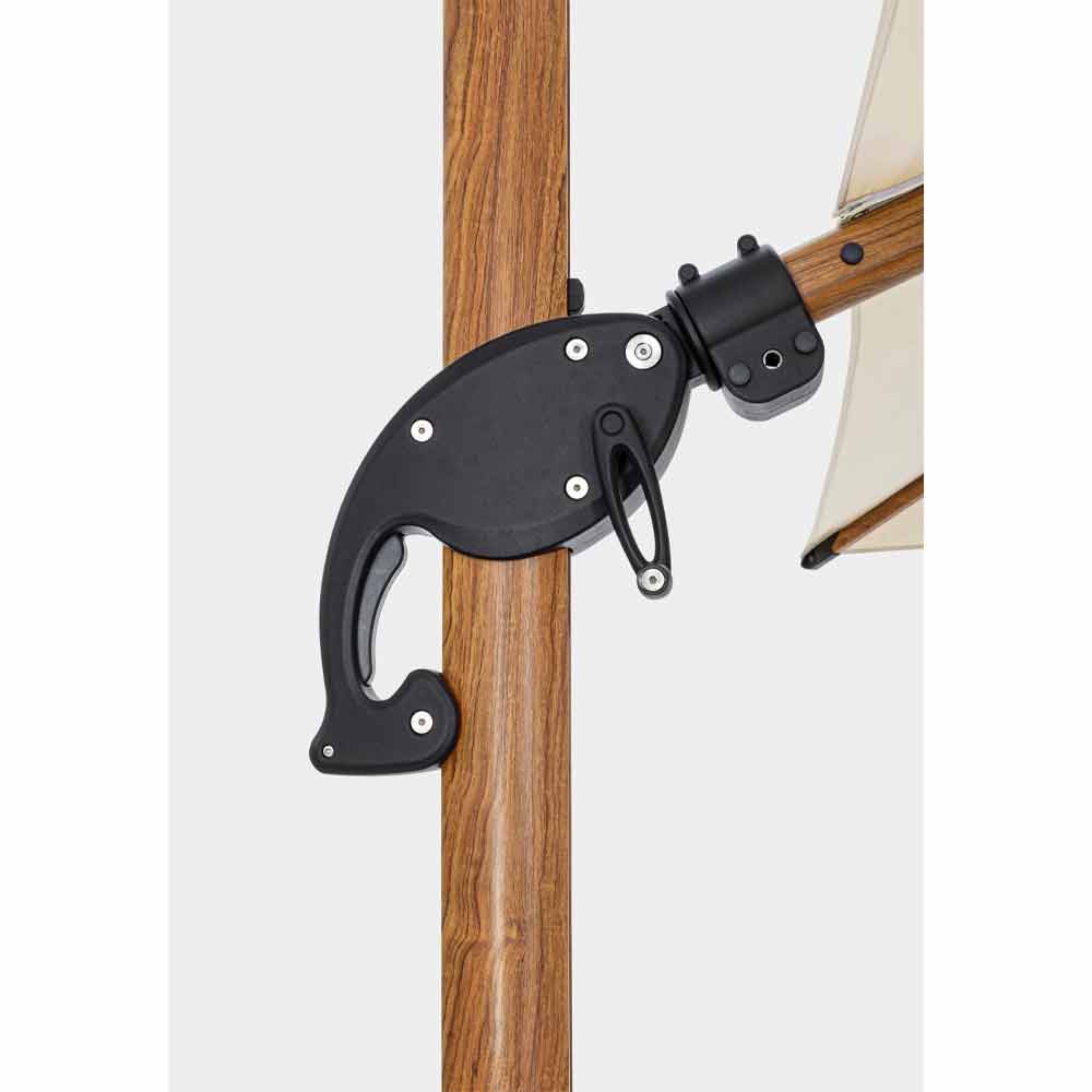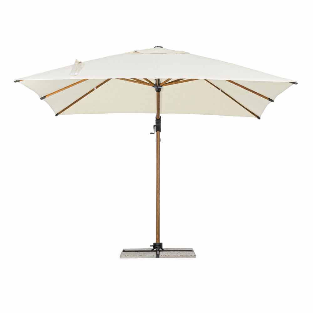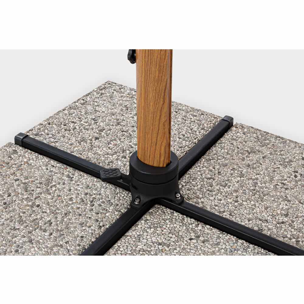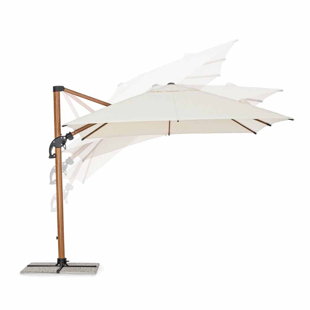 Pulverbeschichtete Aluminiumstruktur (Polyester) mit Holzeffekt. 90x60mm Stange, 8 25x17mm Rippen. Beigefarbenes Polyestergewebe 250 g / m2 mit Pa (Polyamid) -Beschichtung. Kreuzsockel aus Stahl . 360 ° drehbare Stange mit Pedal. Vertikale Neigung mit 6-Positionen-Griff. Ausgestattet mit Rechts-Links-Kippsystem für Regenschirm. Inklusive Regenschirmabdeckung.