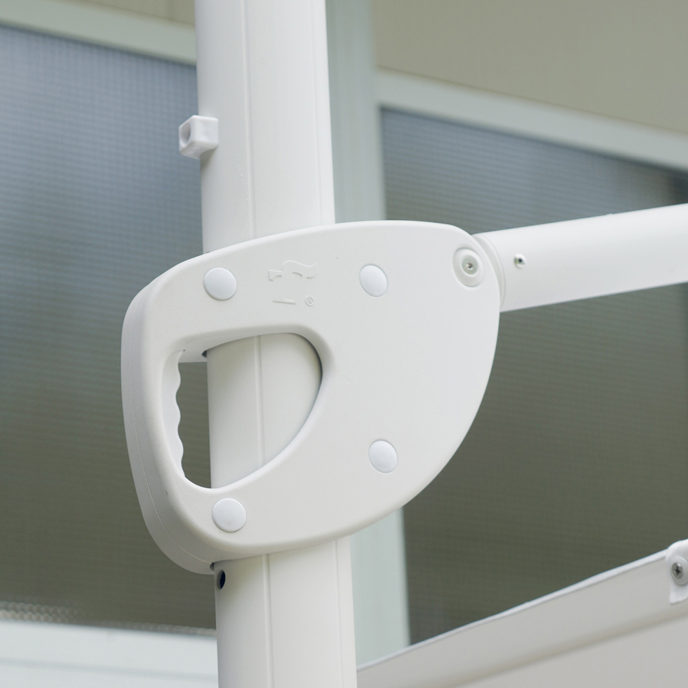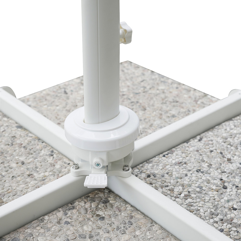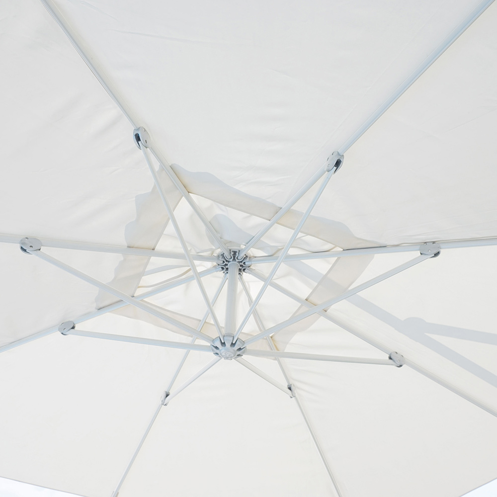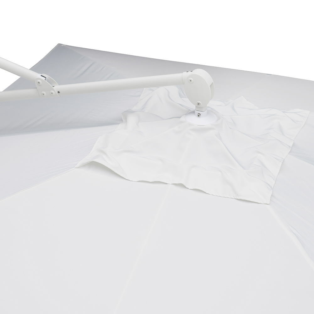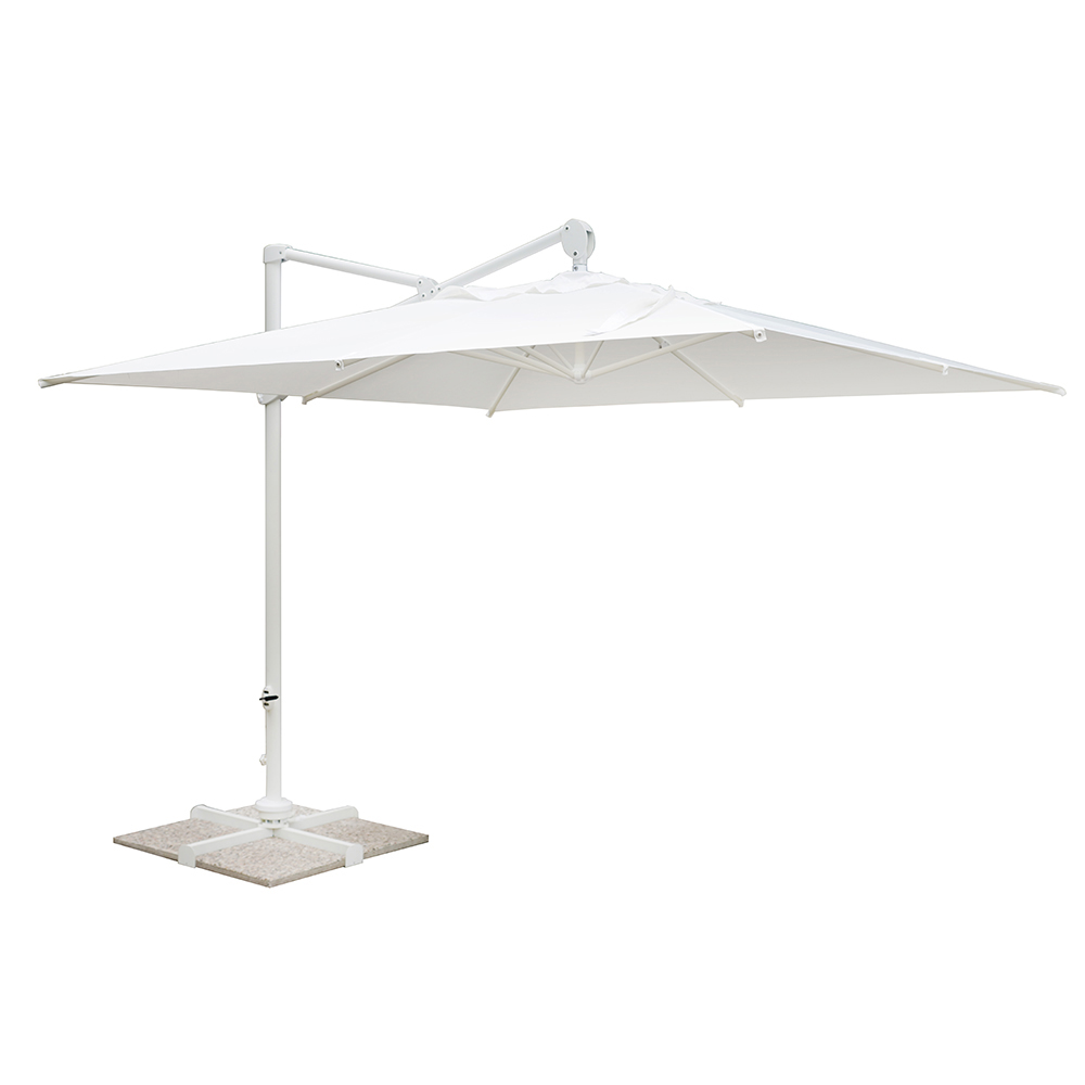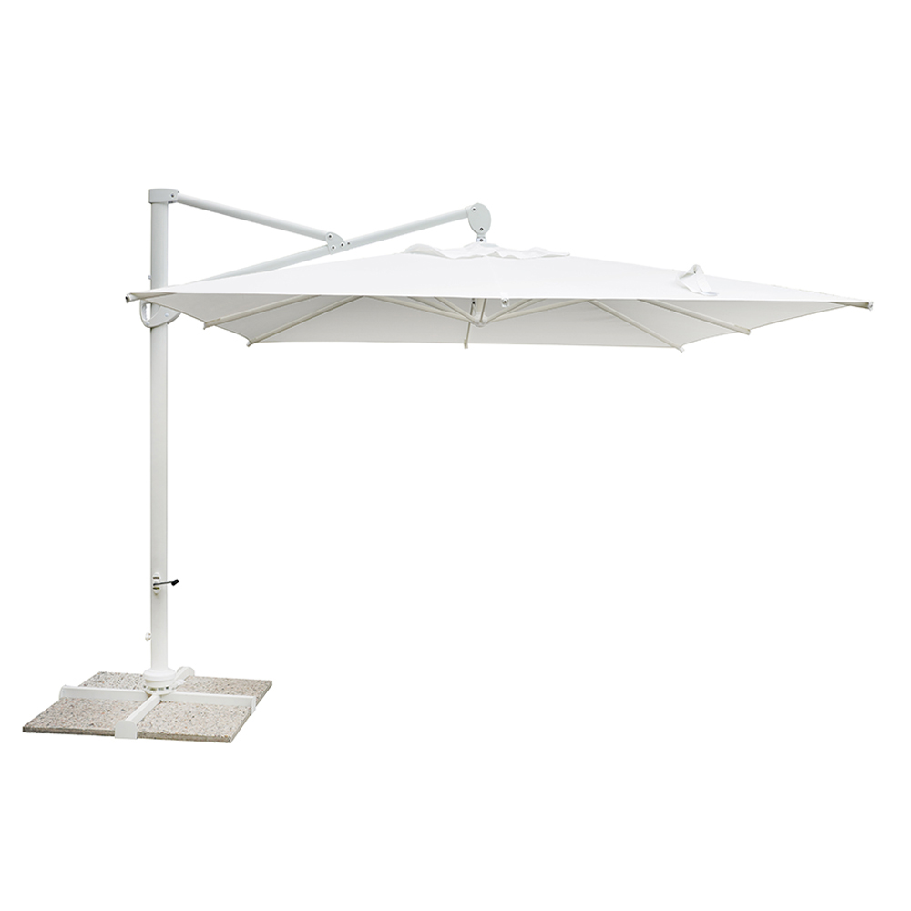 Quadratischer Regenschirm für den Außenbereich mit weißer Aluminiumstruktur.