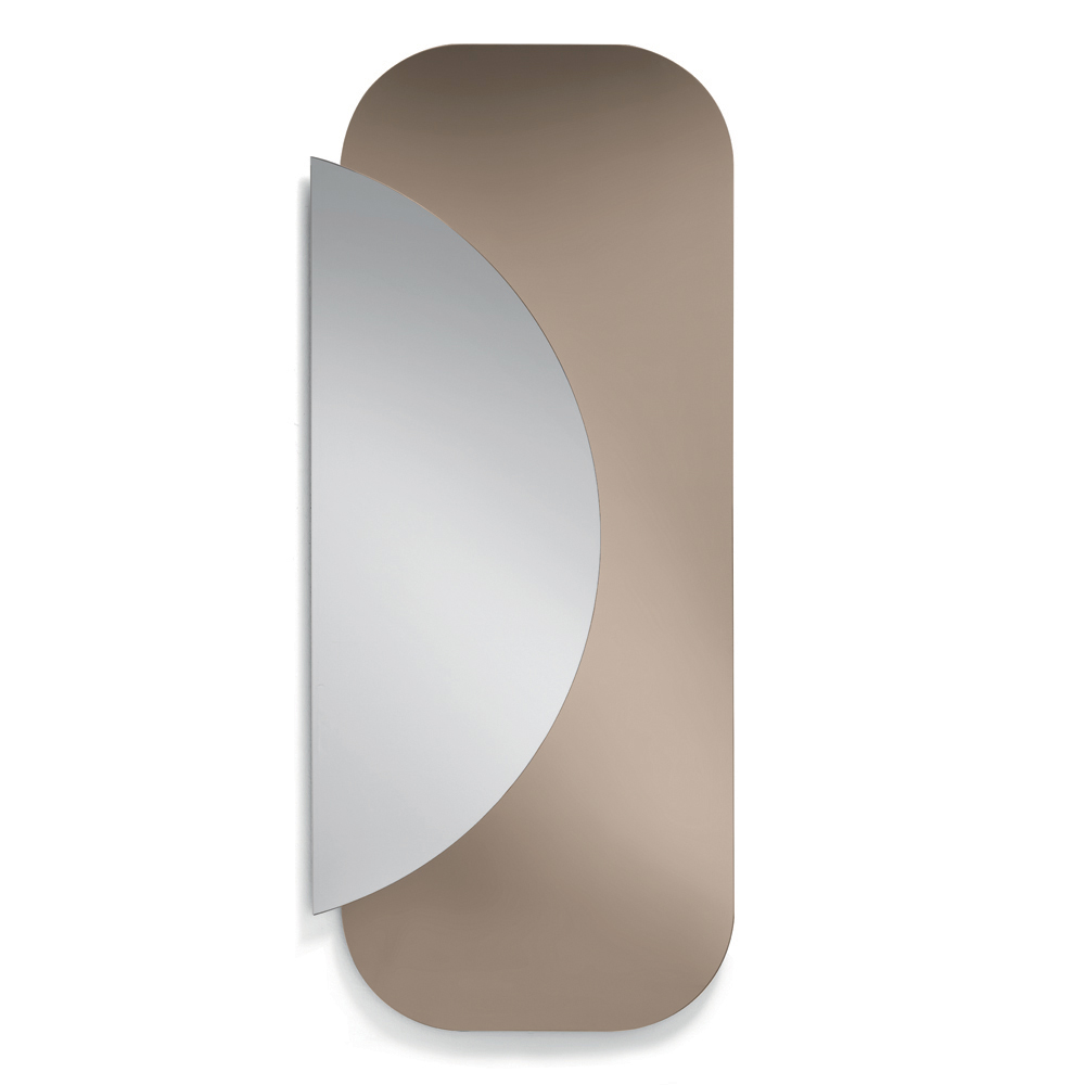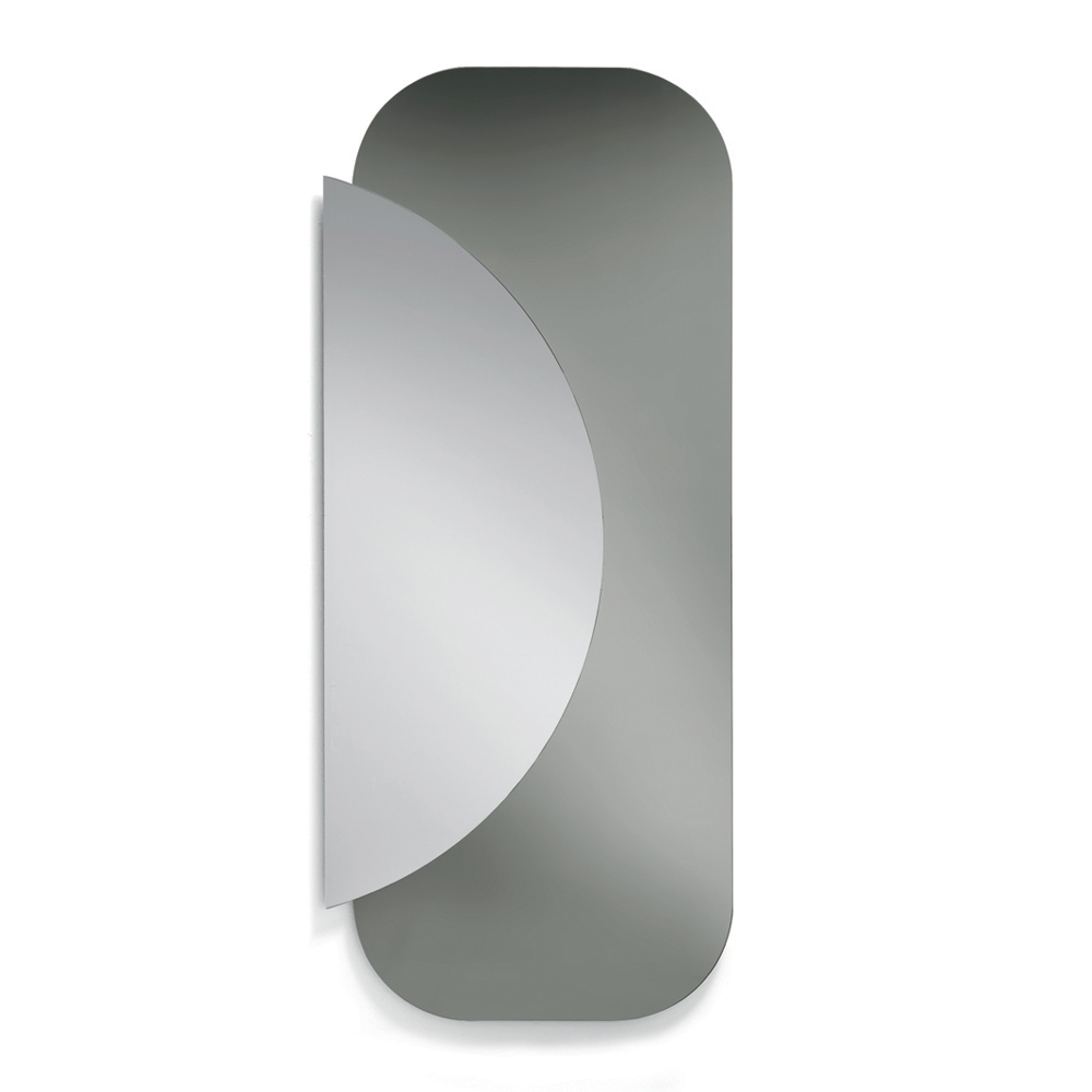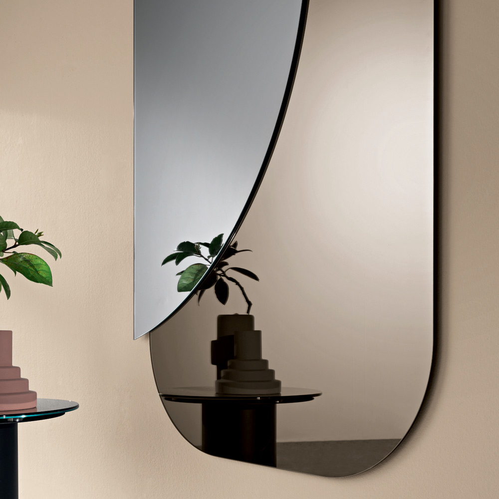 Die Komposition besteht aus zwei sich überlappenden, geformten Platten : einer rechteckigen Basis mit abgerundeten Ecken und einem halbkreisförmigen, natürlichen Spiegel , der sich darüberlegt und so einen eleganten Dialog zwischen Geometrie und Spiegelungen erzeugt. Dieser Kontrast zwischen Formen und Materialien bewirkt eine dynamische und zeitgemäße visuelle Wirkung.