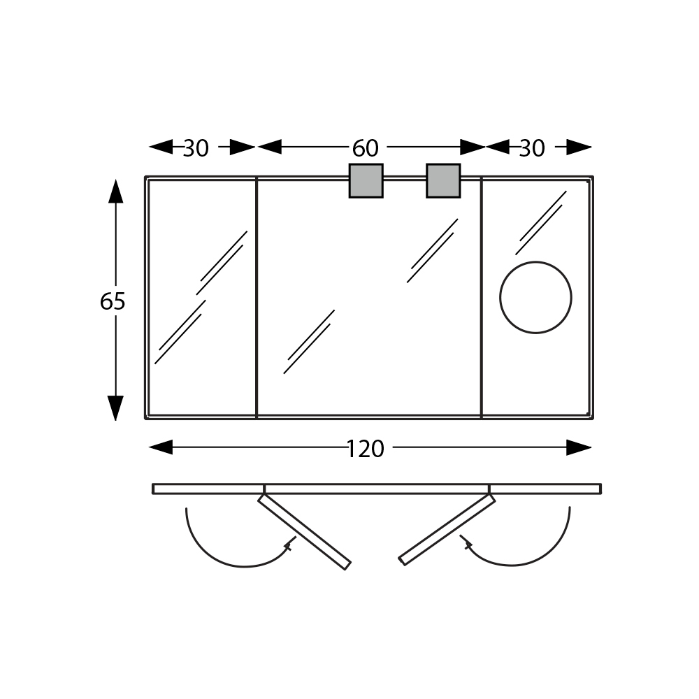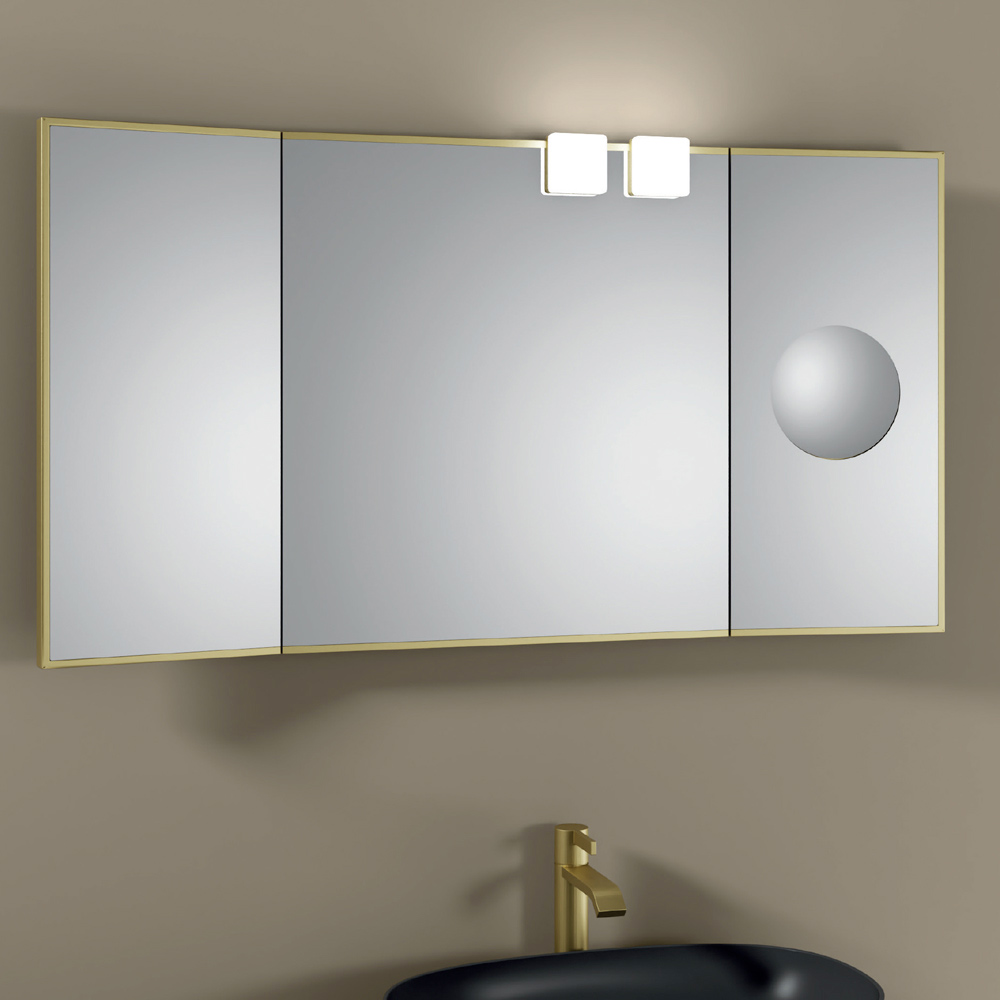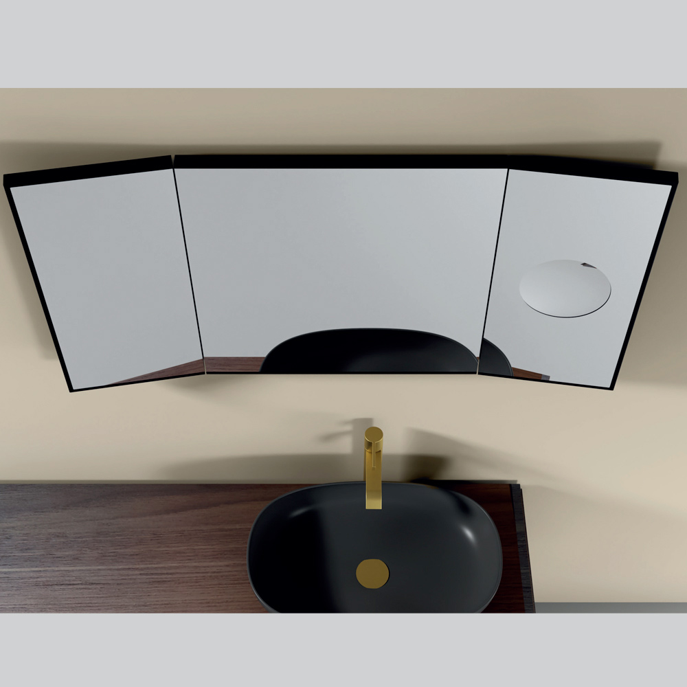 Die beiden beweglichen Seitenwände lassen sich öffnen, um zusätzliche Winkel freizugeben, was eine vollständige und vielseitige Ansicht ermöglicht, ideal für gemeinsame Umgebungen oder Momente der Körperpflege, die eine breitere Perspektive erfordern. Diese Funktion macht den Spiegel äußerst anpassungsfähig und anpassbar an die Bedürfnisse derjenigen, die ihn verwenden.