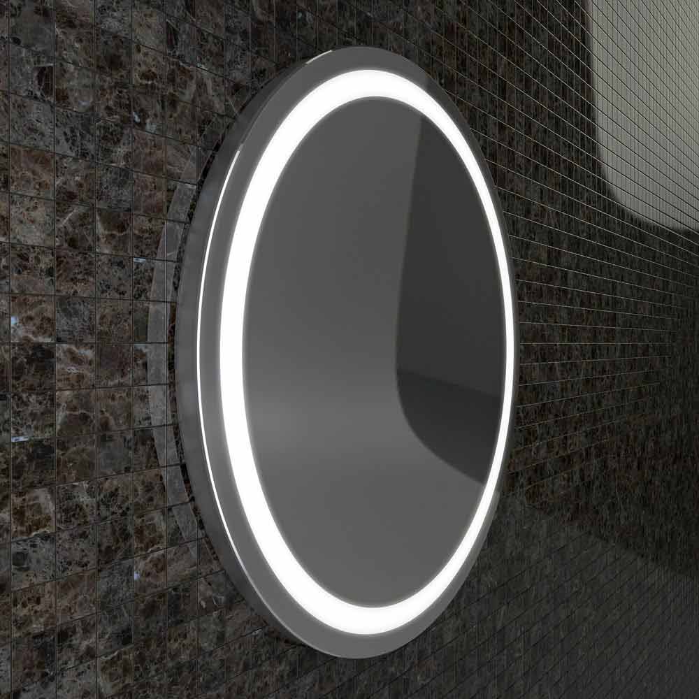 Runder Spiegel mit in den Spiegel integrierter LED-Beleuchtung mit Edelstahlkanten.