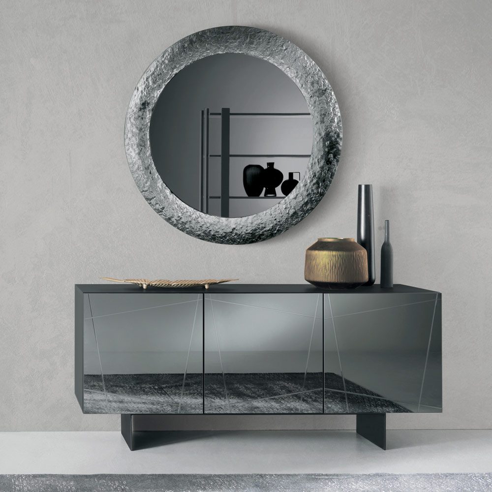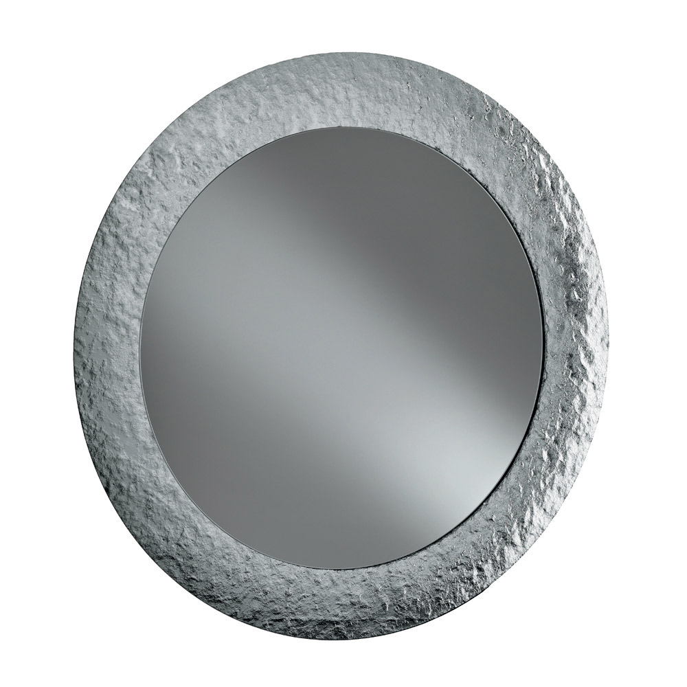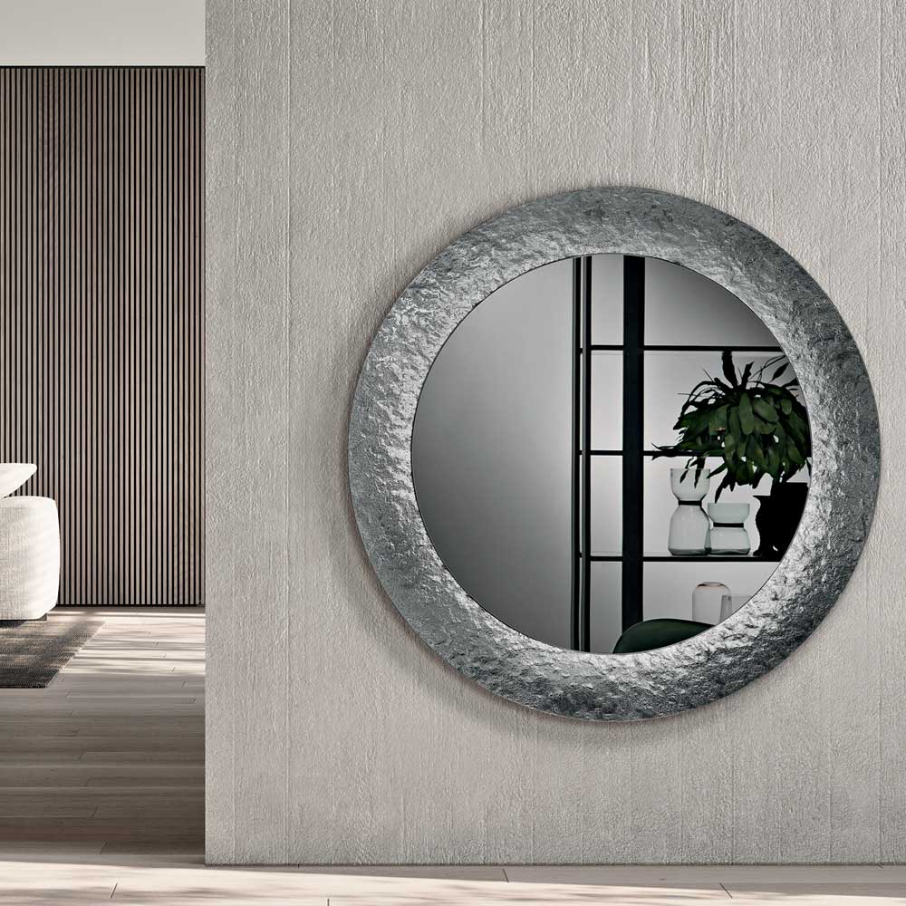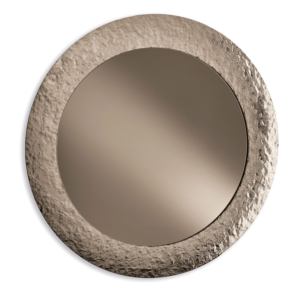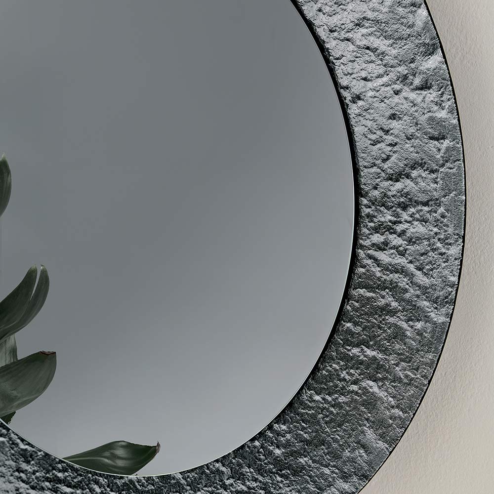 Der Spiegel besticht durch seine runde Form und einen Ton-in-Ton gehaltenen, rückseitig versilberten Rahmen aus gehämmertem Glas , der der Oberfläche eine lebendige, strukturierte Anmutung verleiht. Die einzigartige Oberfläche reflektiert das Licht auf subtile Weise und erzeugt so ein elegantes Lichtspiel, das den Raum aufwertet, ohne aufdringlich zu wirken.