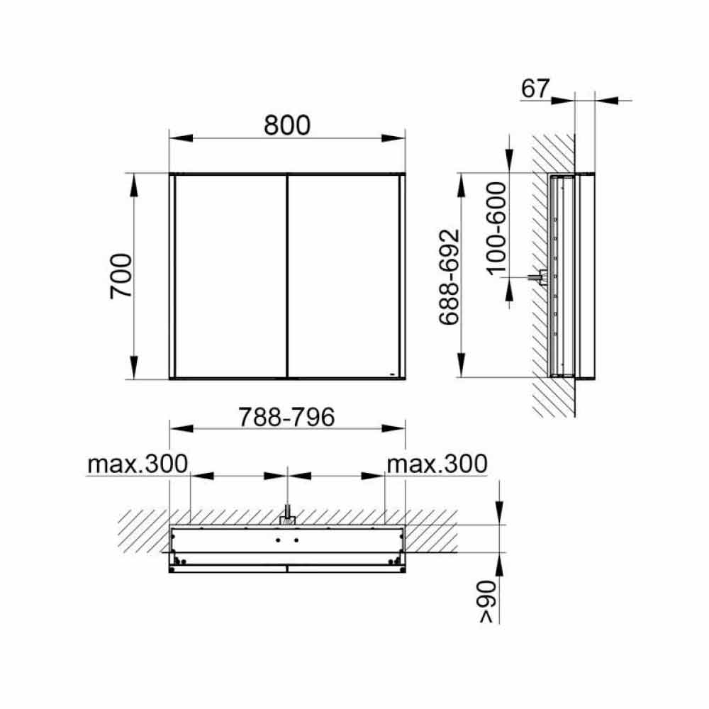 Moderner eingebauter Spiegelschrank mit 2 Türen und LED-Licht.