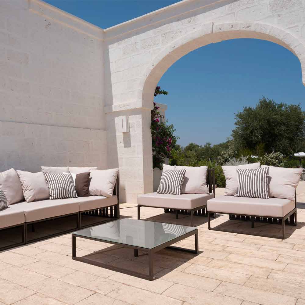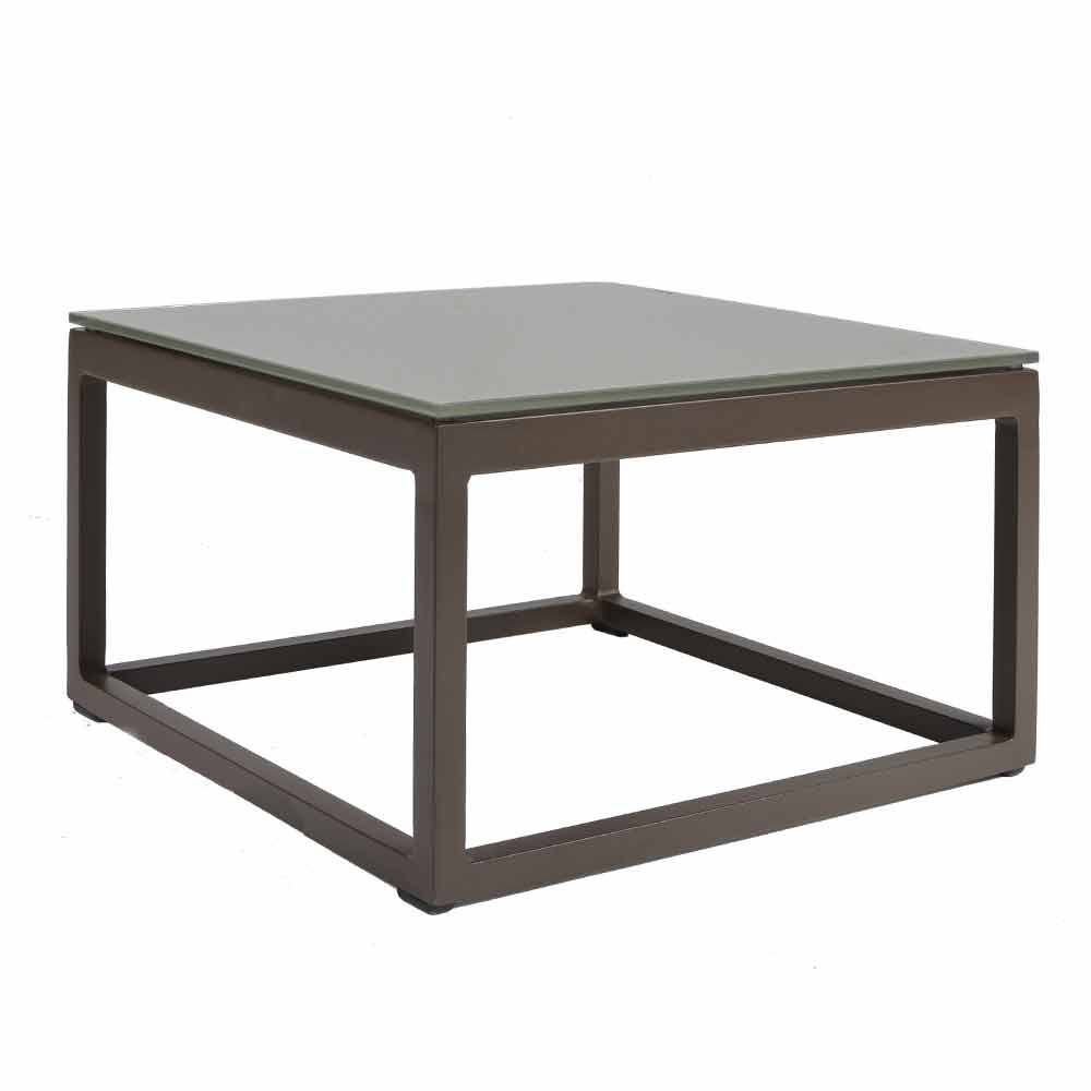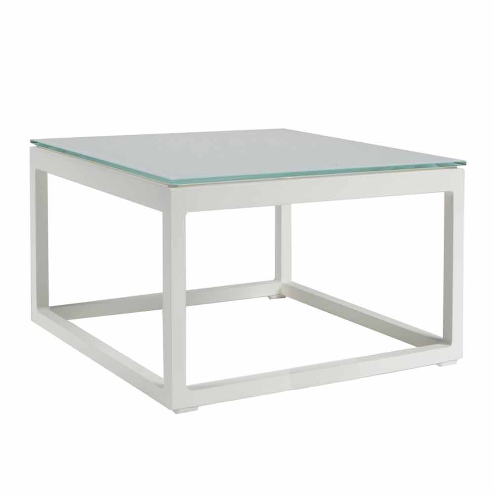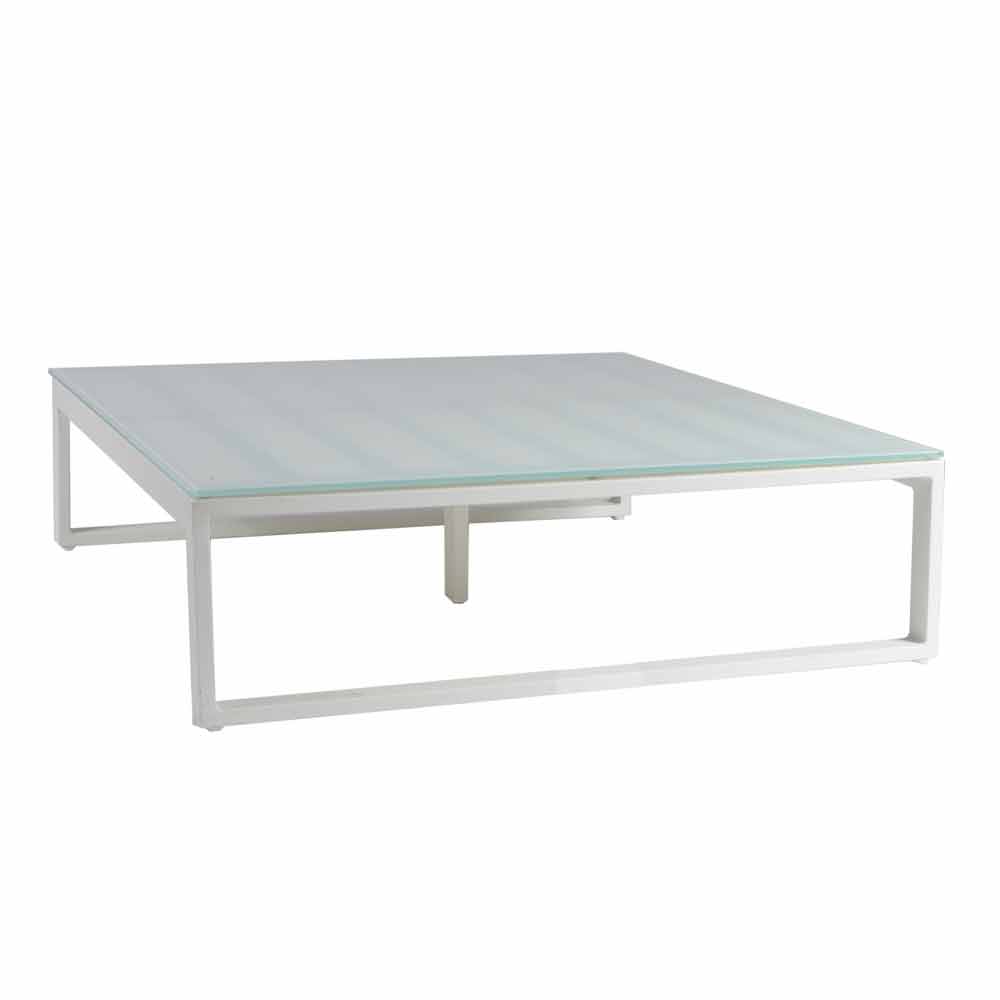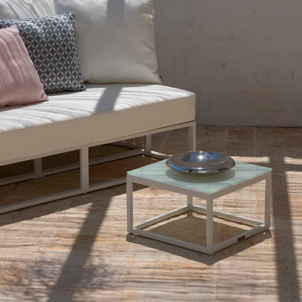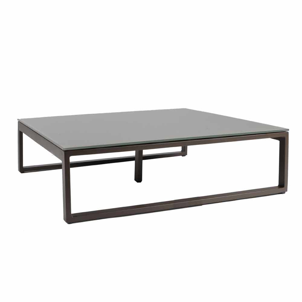 Niedriger Tisch im Freien mit Aluminiumstruktur in 3 Ausführungen und quadratischer Glas- oder Laminamplatte.
