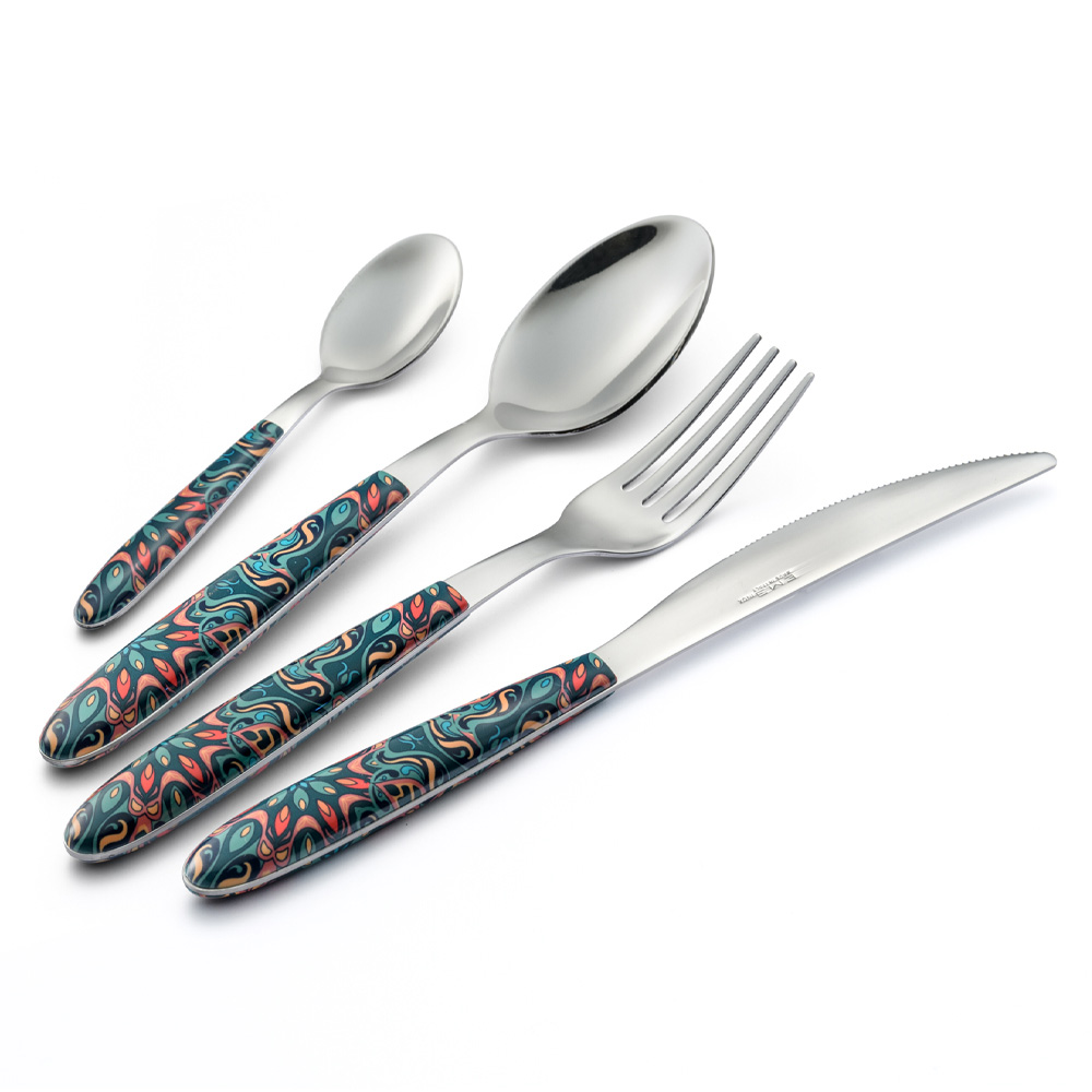Besteck aus Edelstahl und farbigem Kunststoffgriff mit Blumendekor, 24-teilig made in Italy.