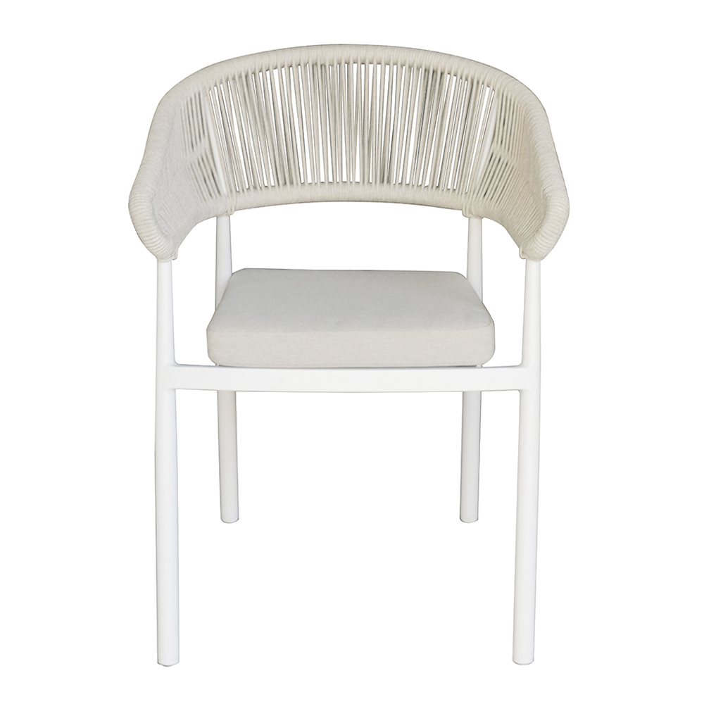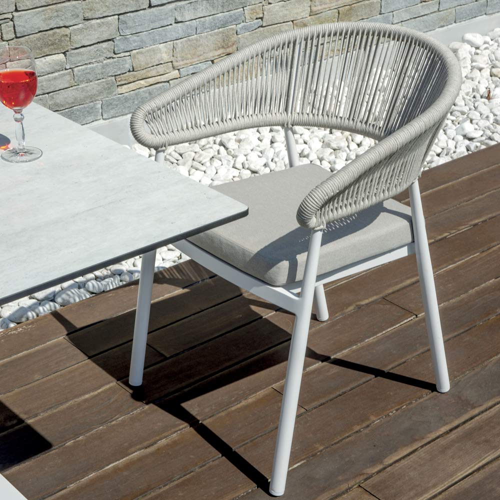 Mit diesem modernen Design-Stuhl verleihen Sie Ihrem Außenbereich einen Hauch von durchdachtem Stil und Zweckmäßigkeit. Die Seilrückenlehne verleiht ihm ein Element handgefertigter Eleganz, während der Aluminium-Lamellensitz Stärke und Komfort bietet und ihn ideal für den täglichen Gebrauch macht.