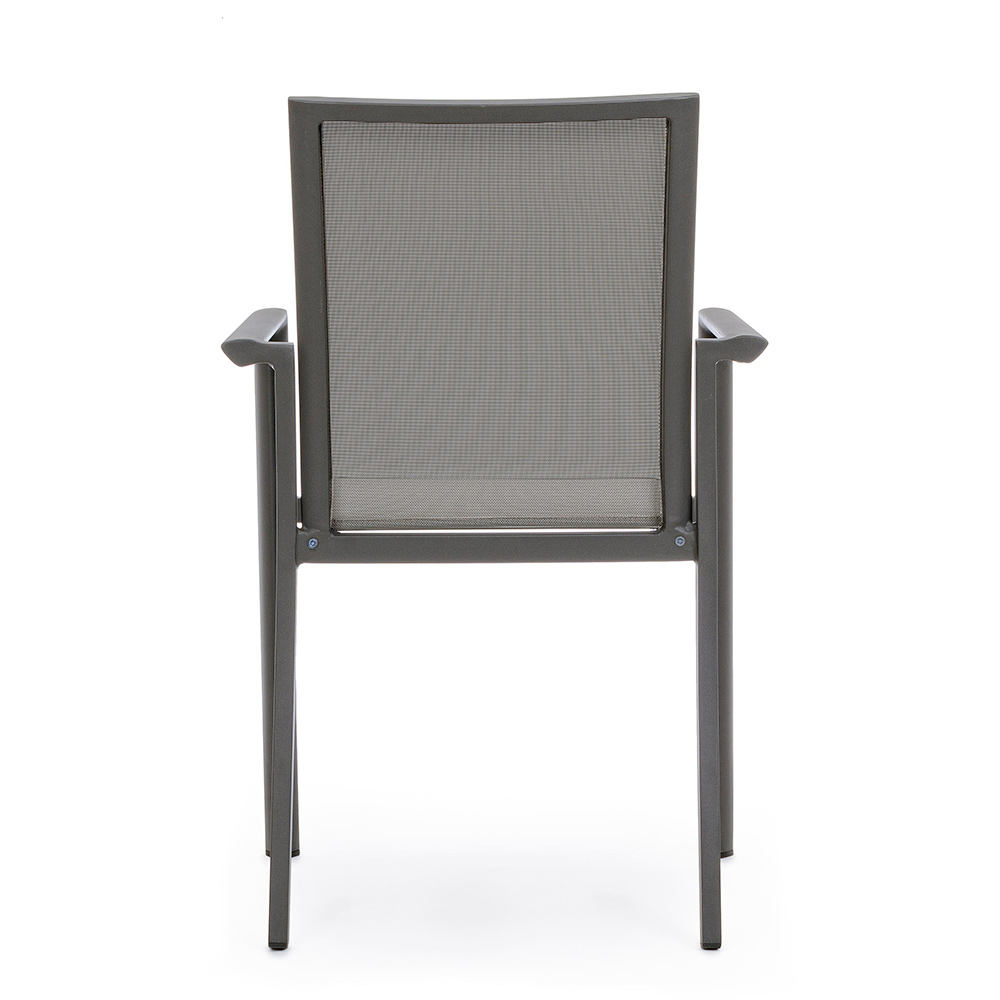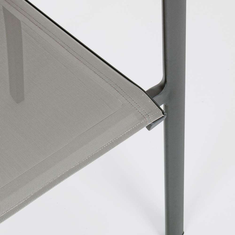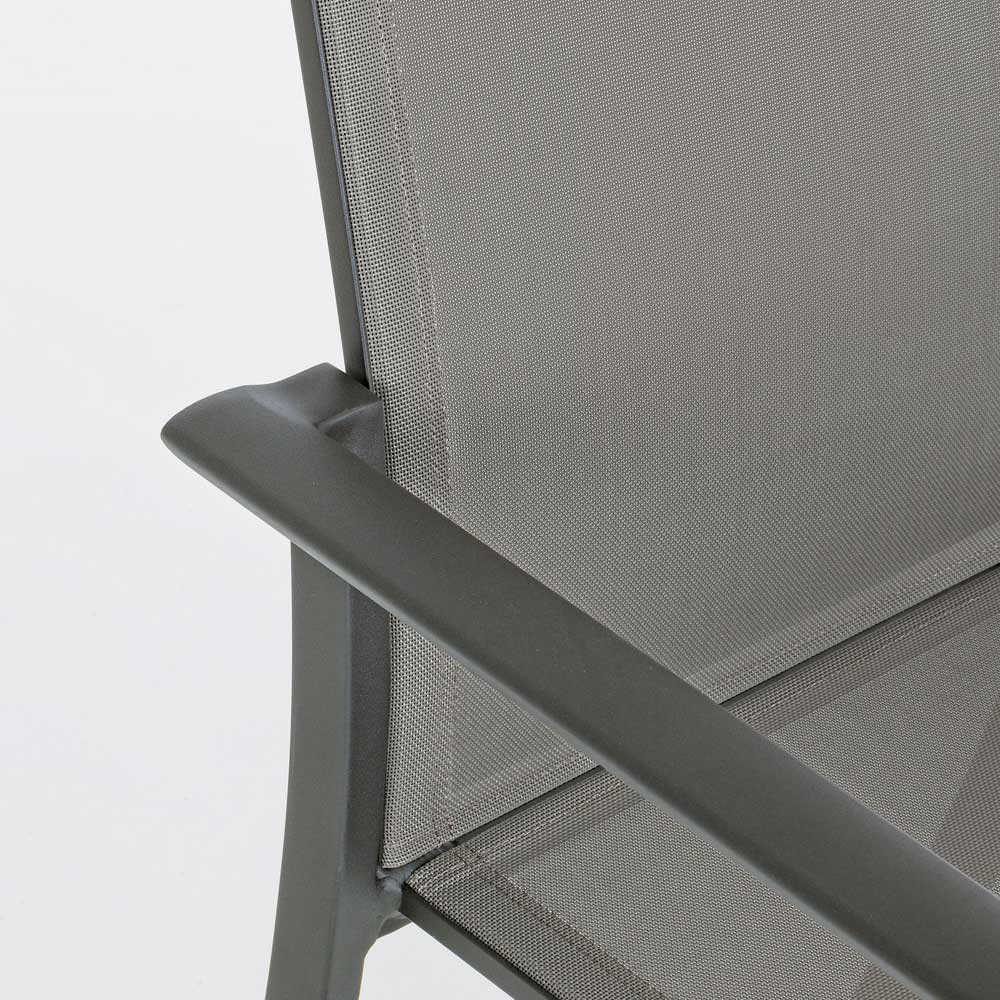 Pulverbeschichtete Aluminiumstruktur (Polyester). Sitz und Rückenlehne mit 1x1 Phifer Textilene bezogen. Stapelbar.