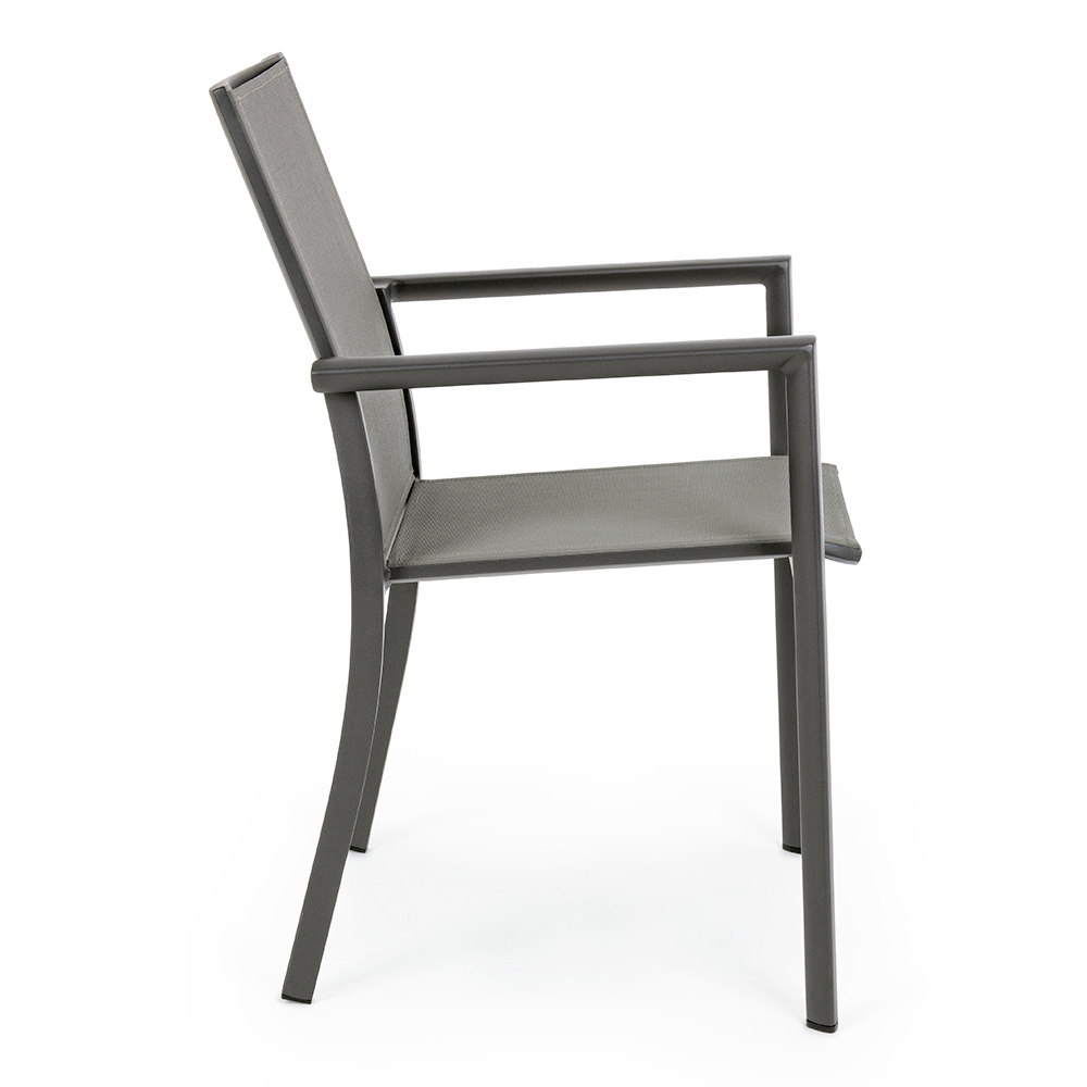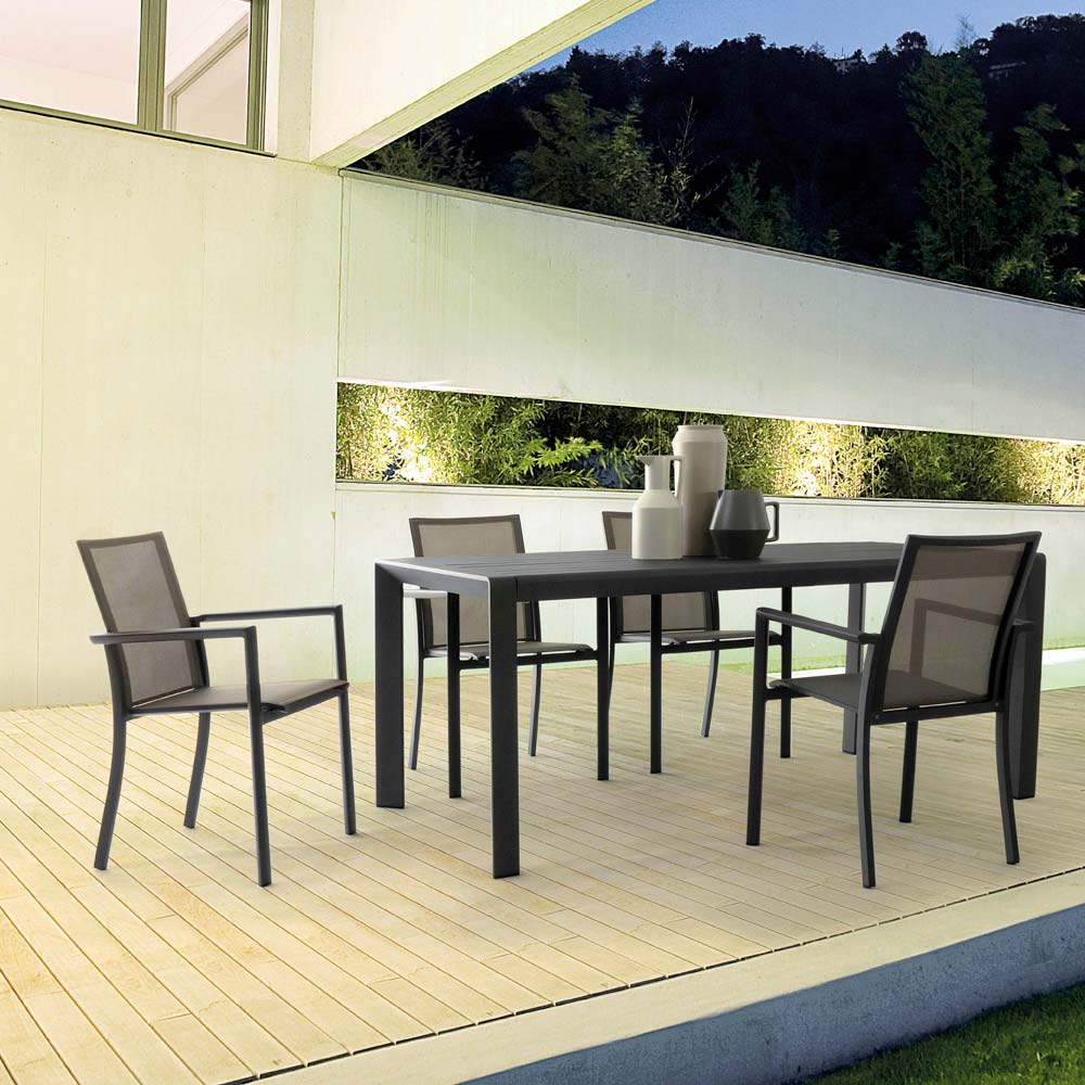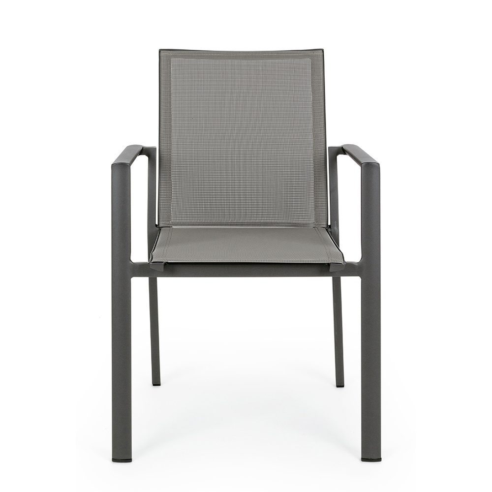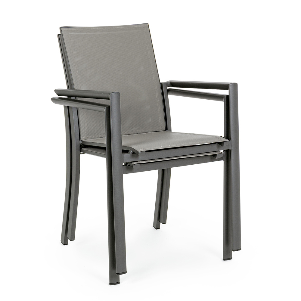 Pulverbeschichtete Aluminiumstruktur (Polyester). Sitz und Rückenlehne mit 1x1 Phifer Textilene bezogen. Stapelbar.