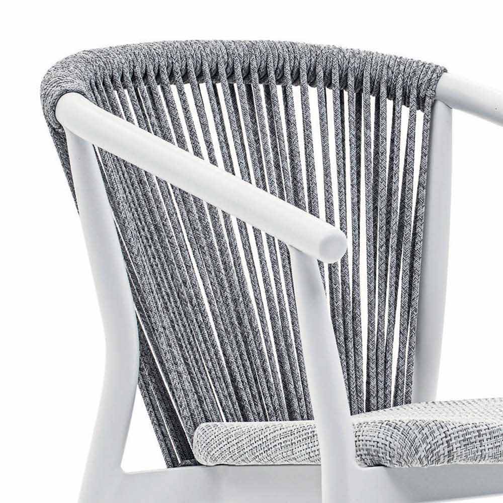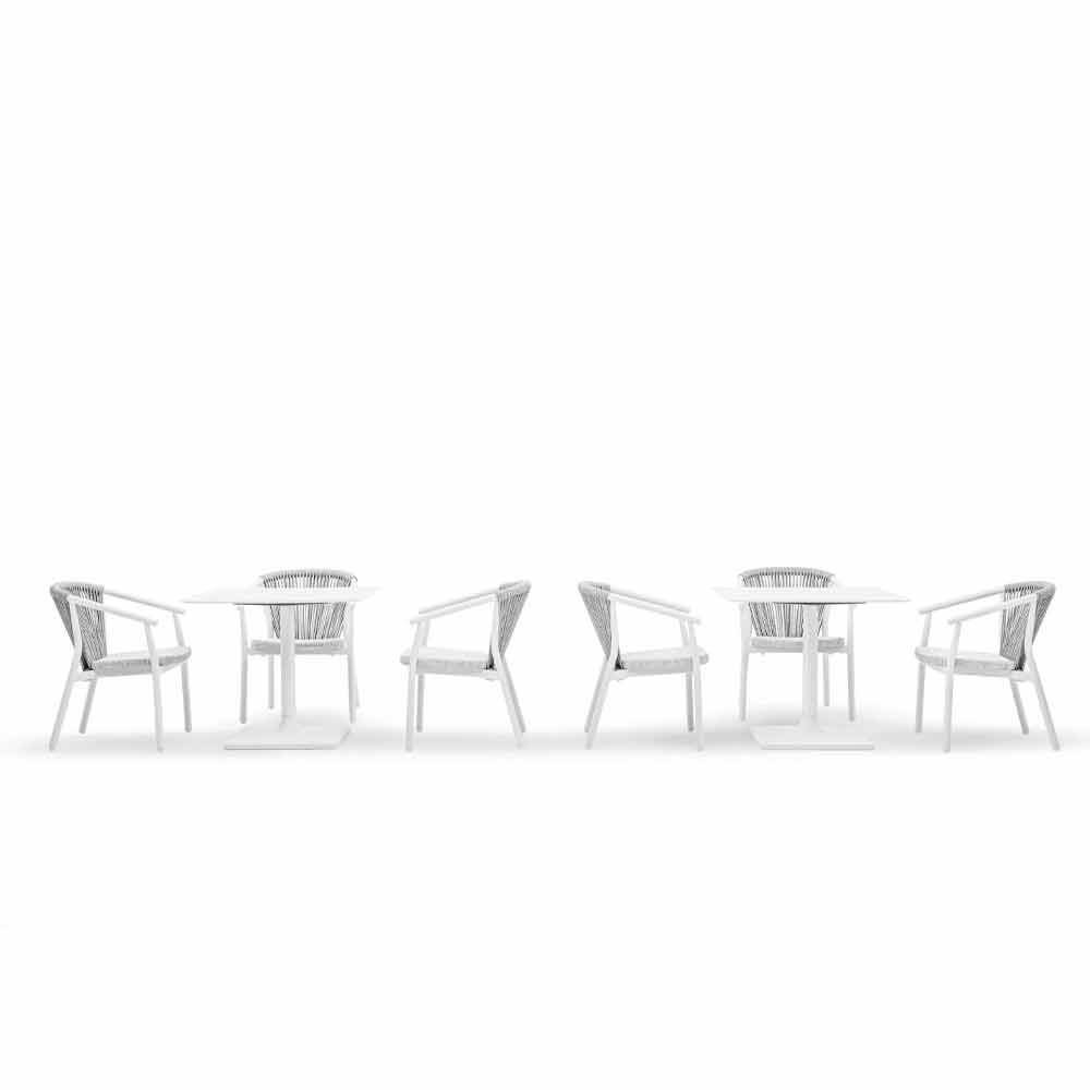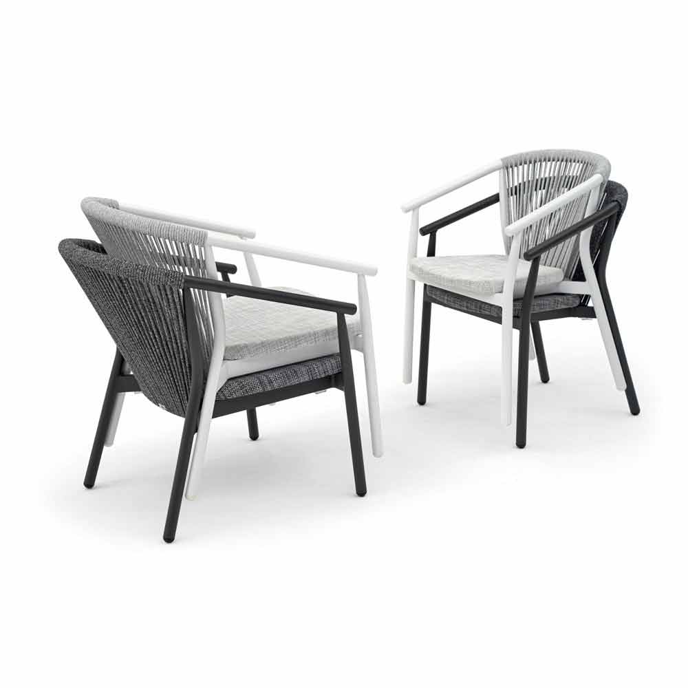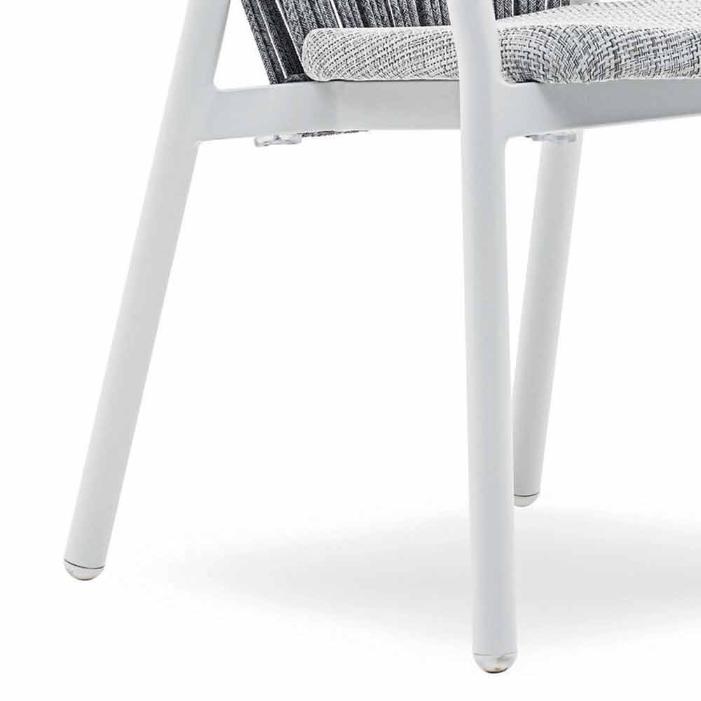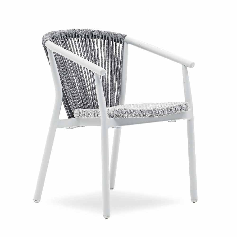 Stapelbarer Gartenstuhl im modernen Design mit Aluminiumbasis und Sitz aus weißem oder aschefarbenem technischen Stoff.