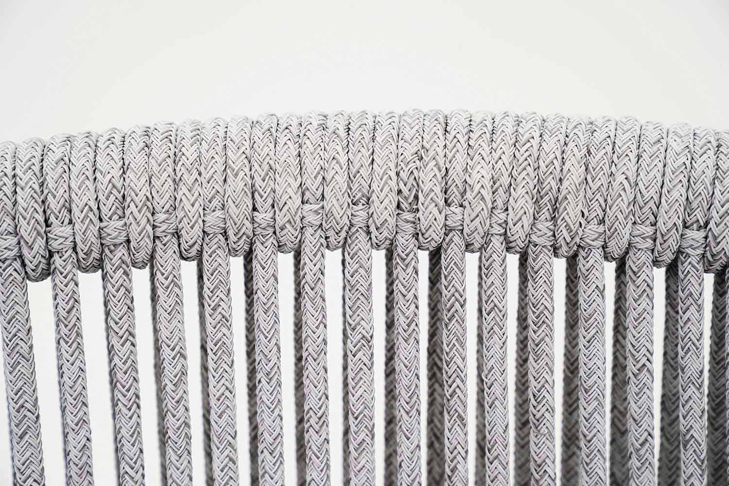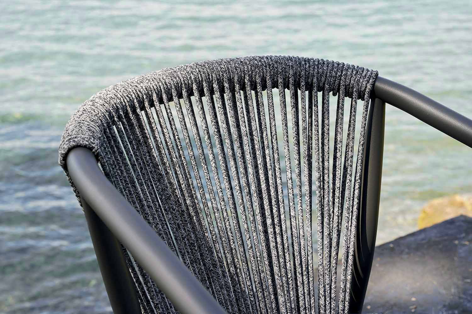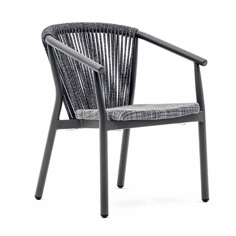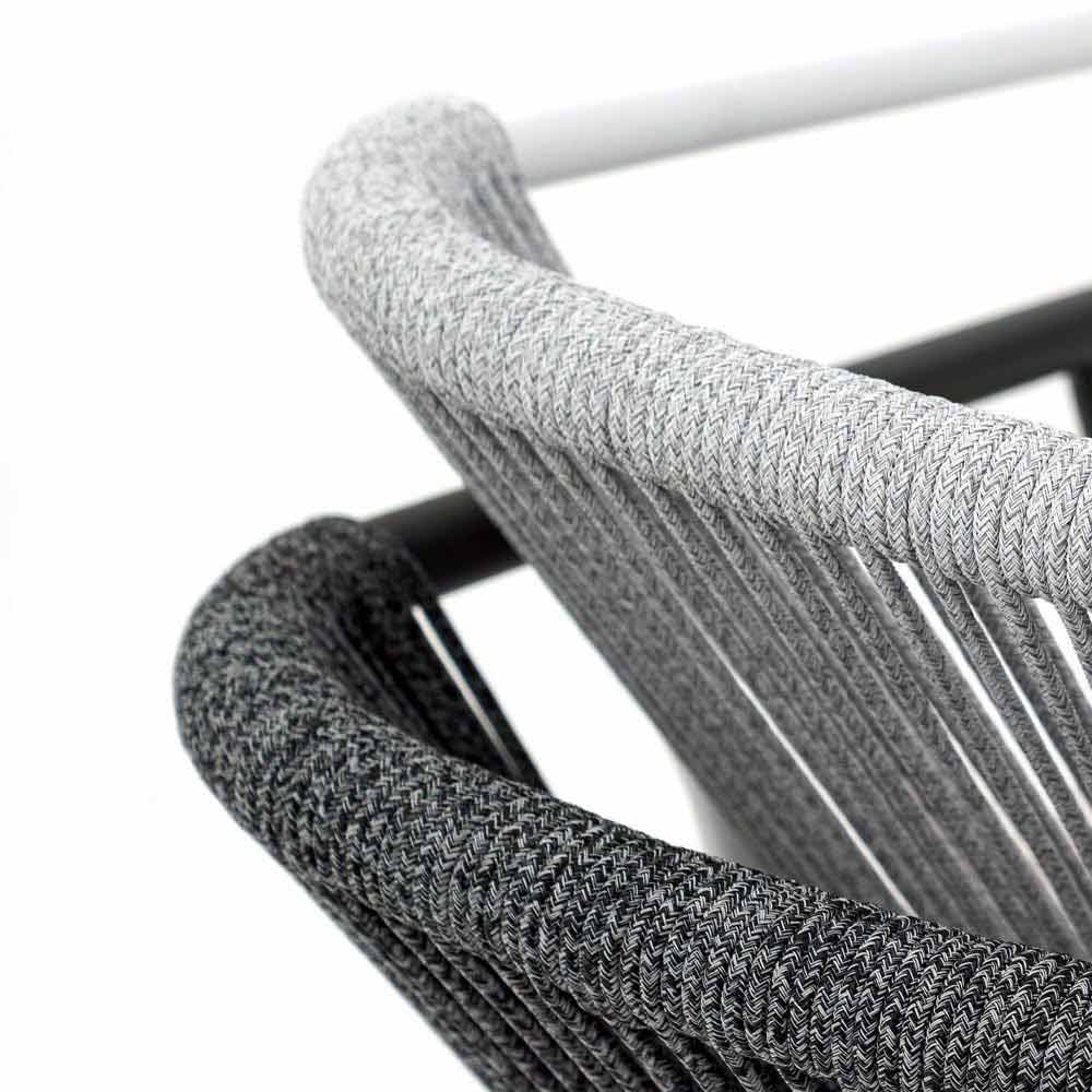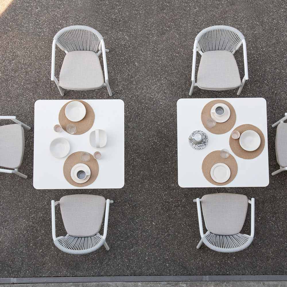 Stapelbarer Gartenstuhl im modernen Design mit Aluminiumbasis und Sitz aus weißem oder aschefarbenem technischen Stoff.