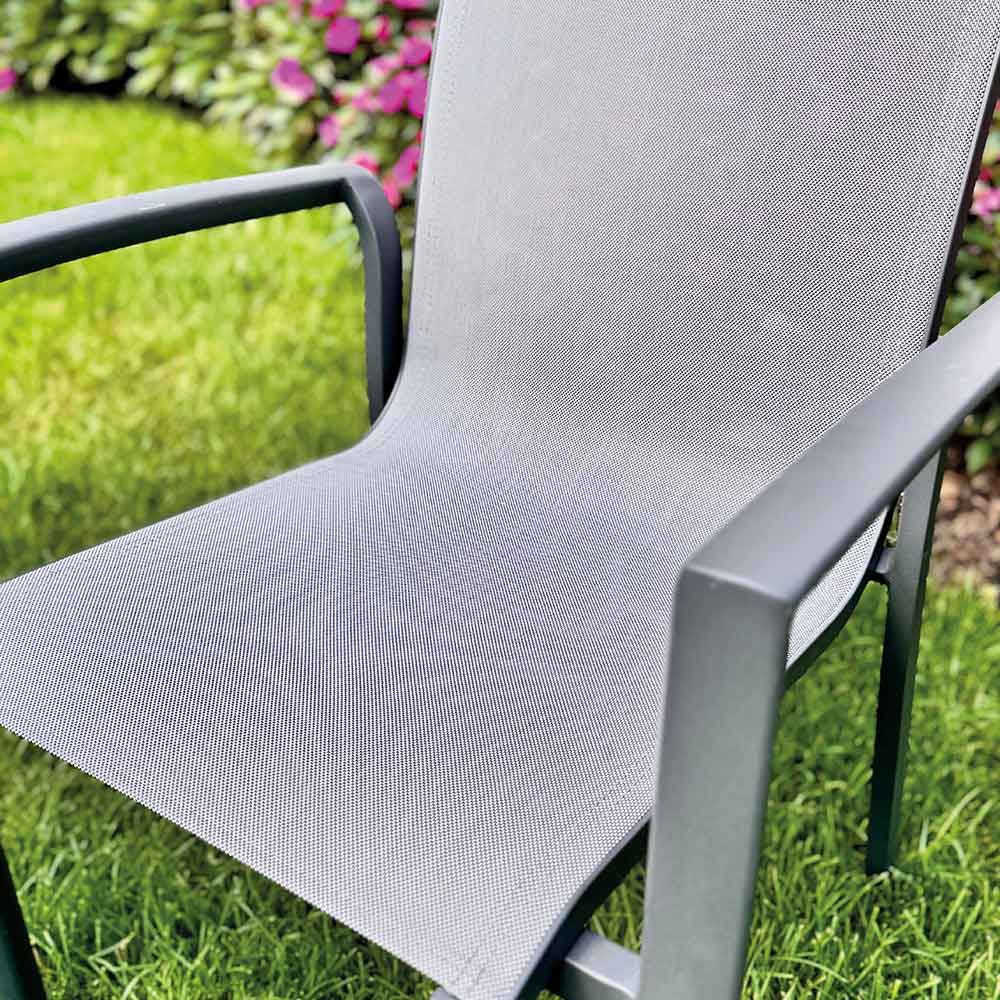 Gartensessel mit anthrazit lackierter Aluminiumstruktur und anthrazitfarbenem Textilene-Netz.