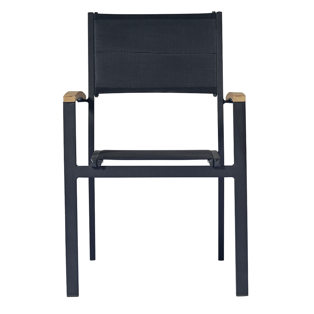 Gartenstuhl aus anthrazitgrauem Aluminium mit Sitz und Rückenlehne aus schwarz gepolstertem Textilene, komplett mit eleganten Armlehnen aus Teakholz . Die Formen der Struktur passen sich am besten an die Silhouette des Körpers an und bieten großen Komfort , auch dank der praktischen Armlehnen, die es Ihnen ermöglichen, eine korrekte und bequeme Position beizubehalten. Ideal für die Einrichtung Ihrer Außenbereiche mit einem Hauch von einzigartigem Stil und einer starken modernen Persönlichkeit .