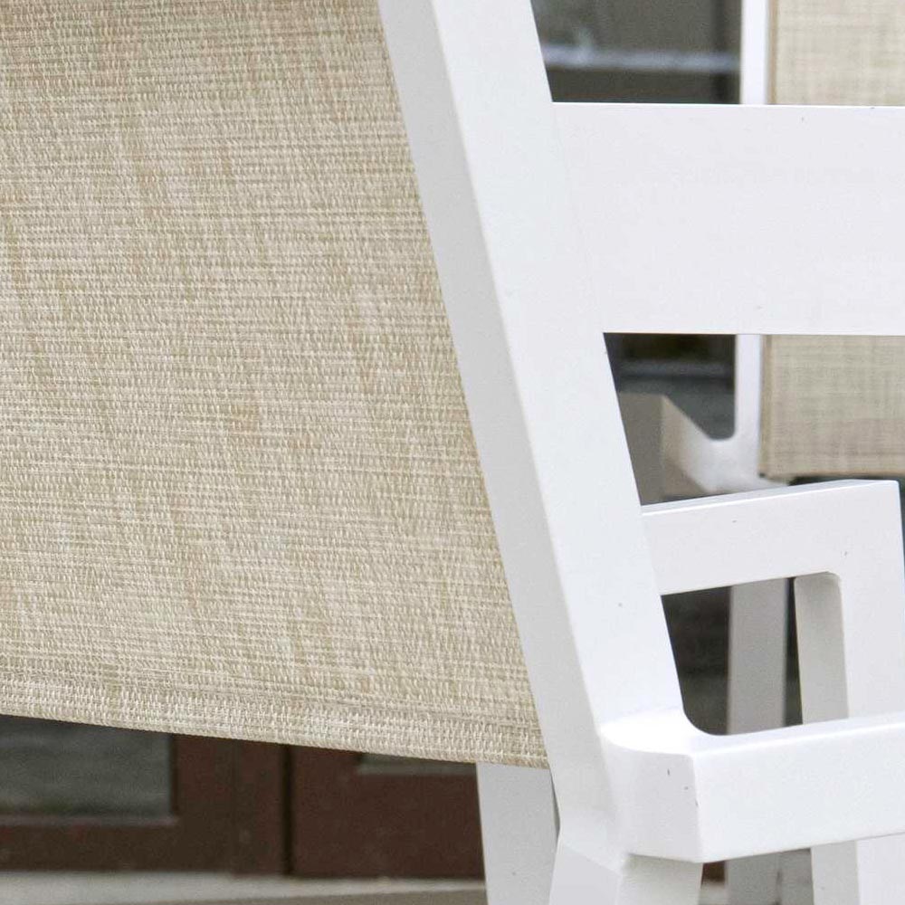 Die robuste Struktur aus mattweißem Aluminium garantiert Langlebigkeit und Widerstandsfähigkeit gegen die Elemente und behält seine Schönheit im Laufe der Zeit. Der beige Textilene Bezug verleiht nicht nur einen Hauch von Klasse mit seiner raffinierten Textur, sondern bietet auch einen unschlagbaren Komfort dank seiner Elastizität und Atmungsaktivität.