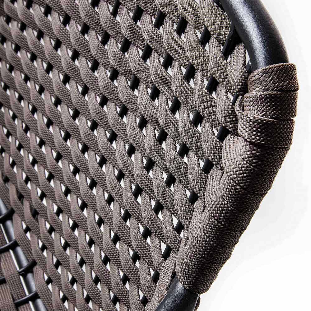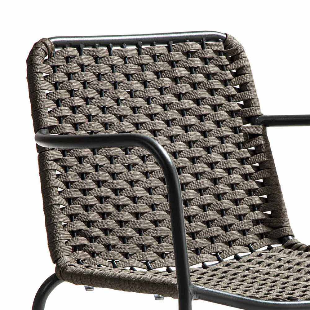 Gartenstuhl aus Anthrazit-Finish verzinktes Metall mit Sitz und Rückenlehne aus gewebtem Polyesterseil (Gummi-Innenseite) Anthrazit-Finish, ausgestattet mit Armlehnen und stapelbarer Struktur. Aus der Begegnung zwischen einem essentiellen und vielseitigen Design und einer funktionalen und komfortablen Ästhetik entsteht ein Sitz, der perfekt zu jeder Situation im Freien passt und eine perfekte Harmonie mit den anderen vorhandenen Elementen schafft oder auf wunderbaren Stilkontrasten spielt, um ein exklusives und stilvolles Ergebnis zu erzielen. Avantgarde .